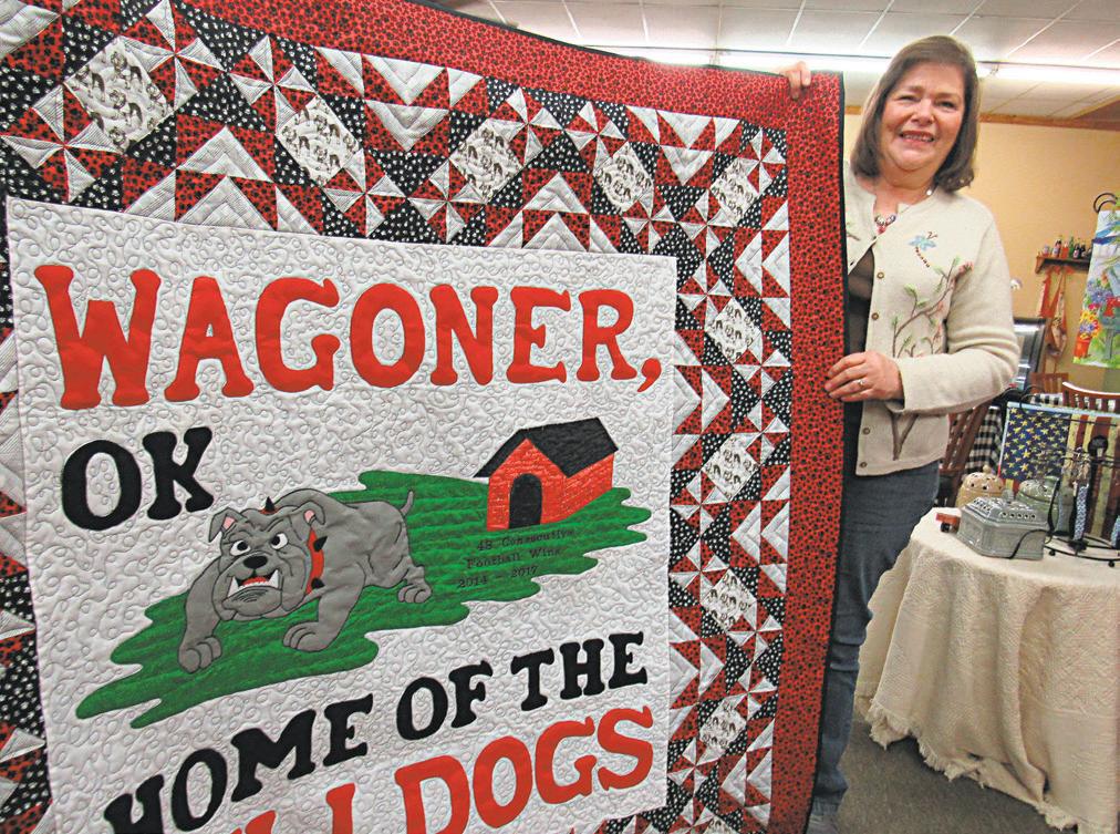 “Bulldog Trails” marks the fifth quilt Vaught has made for the annual fundraiser. Four quilts have featured Wagoner’s bulldog mascot.