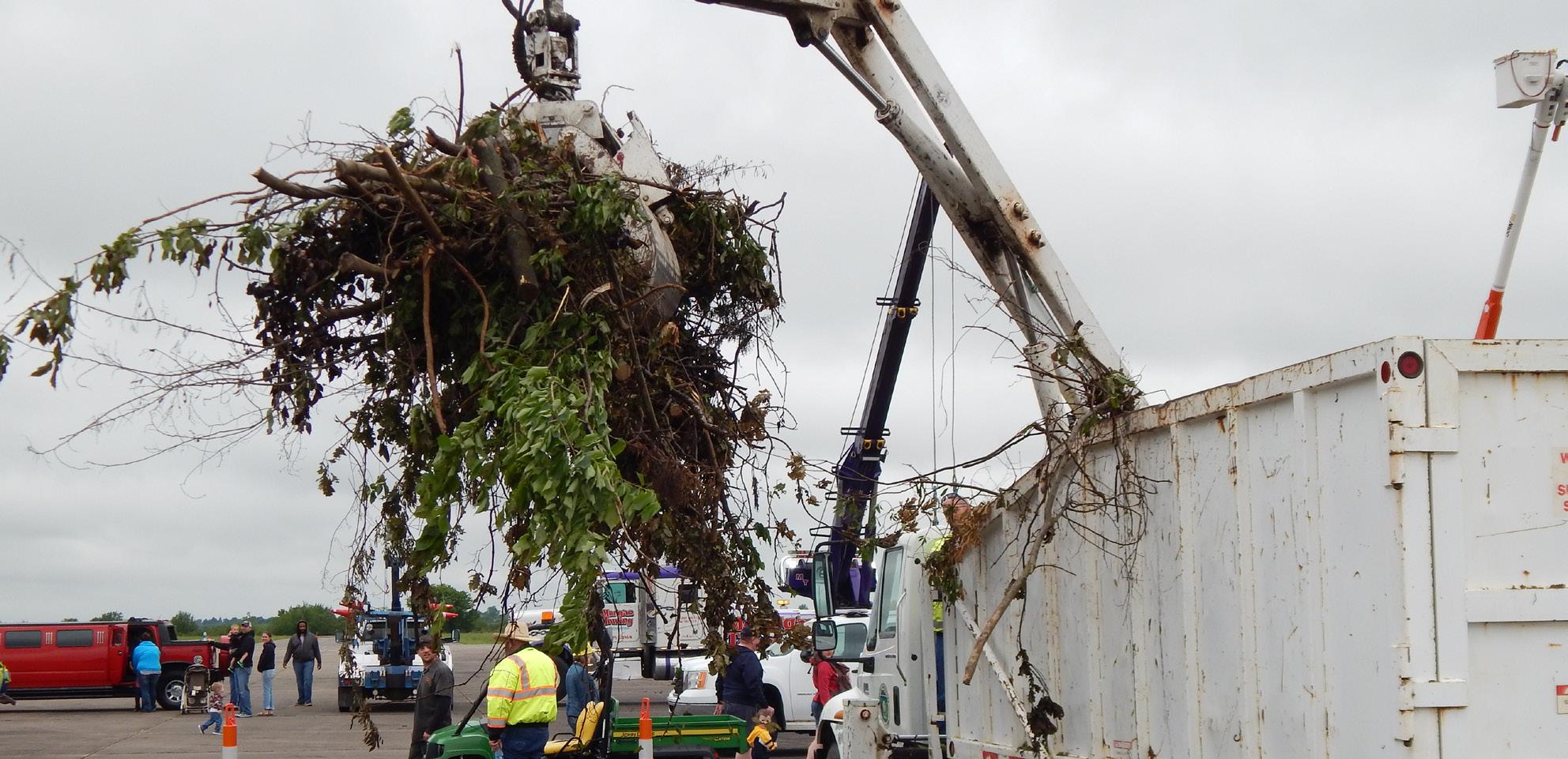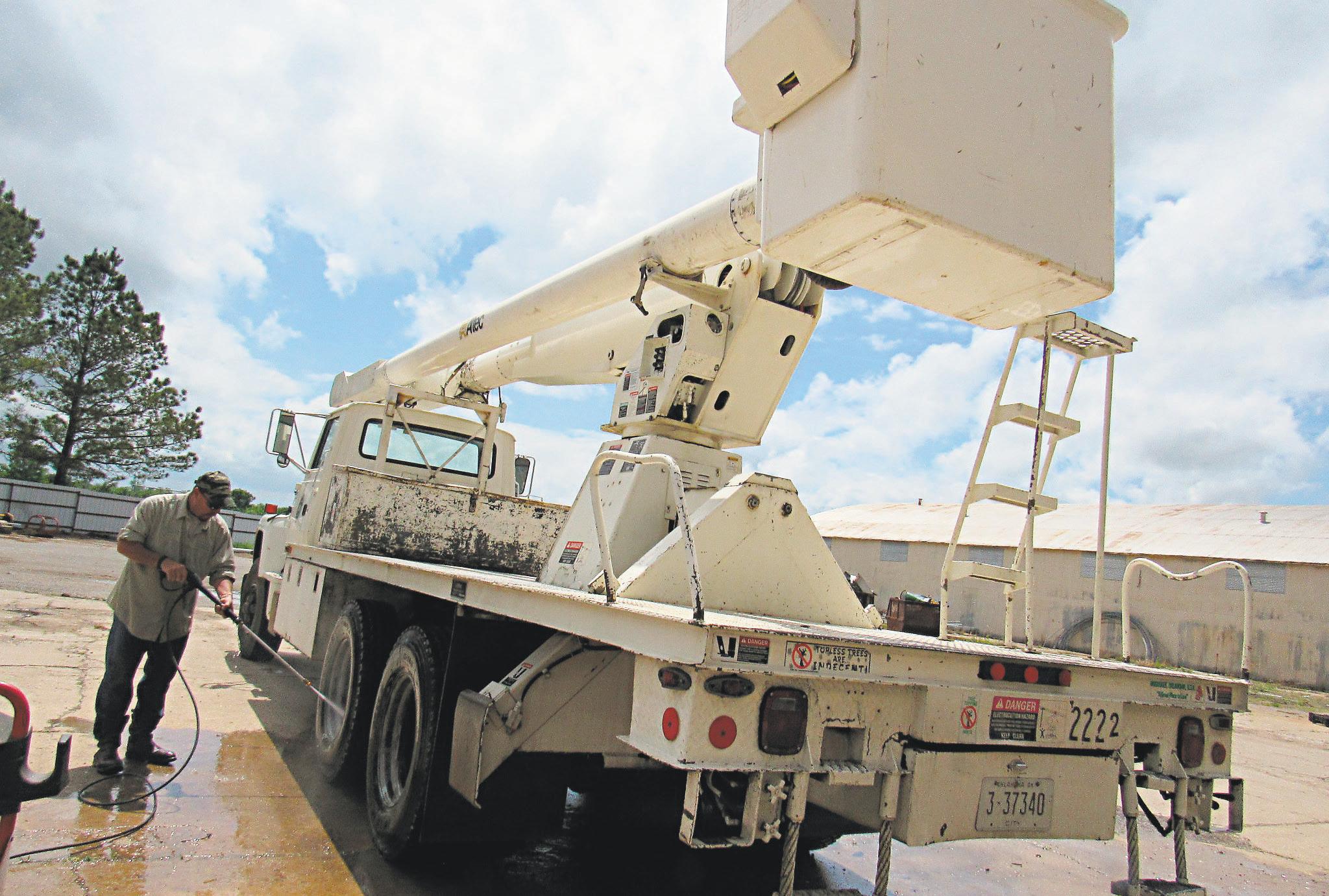 Muskogee Urban Forester Nick Frazee touts the city’s bucket truck, which enables workers to trim high up in trees or put banners on poles.