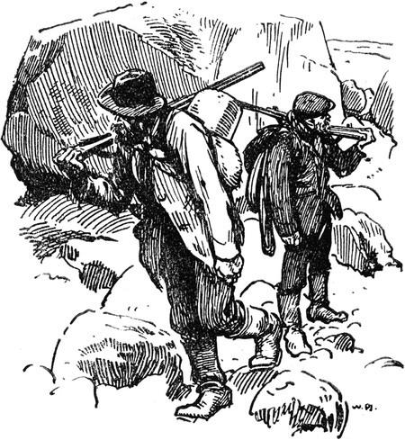 Einen Monat später kam ein Trupp Goldgräber in das böse Land. Es waren sieben Mann, die recht wunderlich aussahen. Sechs davon waren große, wilde Burschen mit mächtigen Bärten und einer Flinte auf der Schulter und mit Dolch und Pistole im Gürtel. Der siebente war ein kleiner armseliger Gesell; er war ihr Koch, Diener und Schuhputzer und stets bereit, alles zu tun, wenn er nur einen kleinen Anteil an dem Golde bekam.