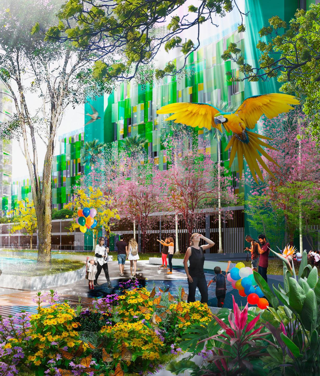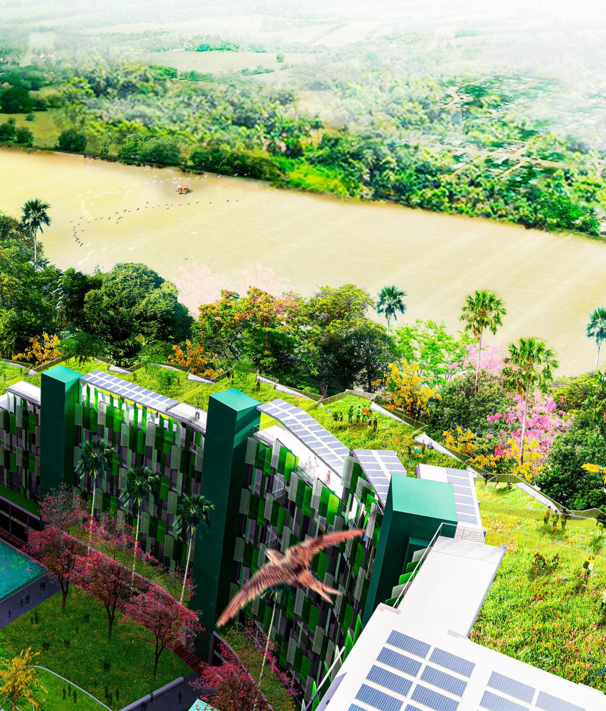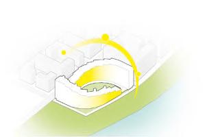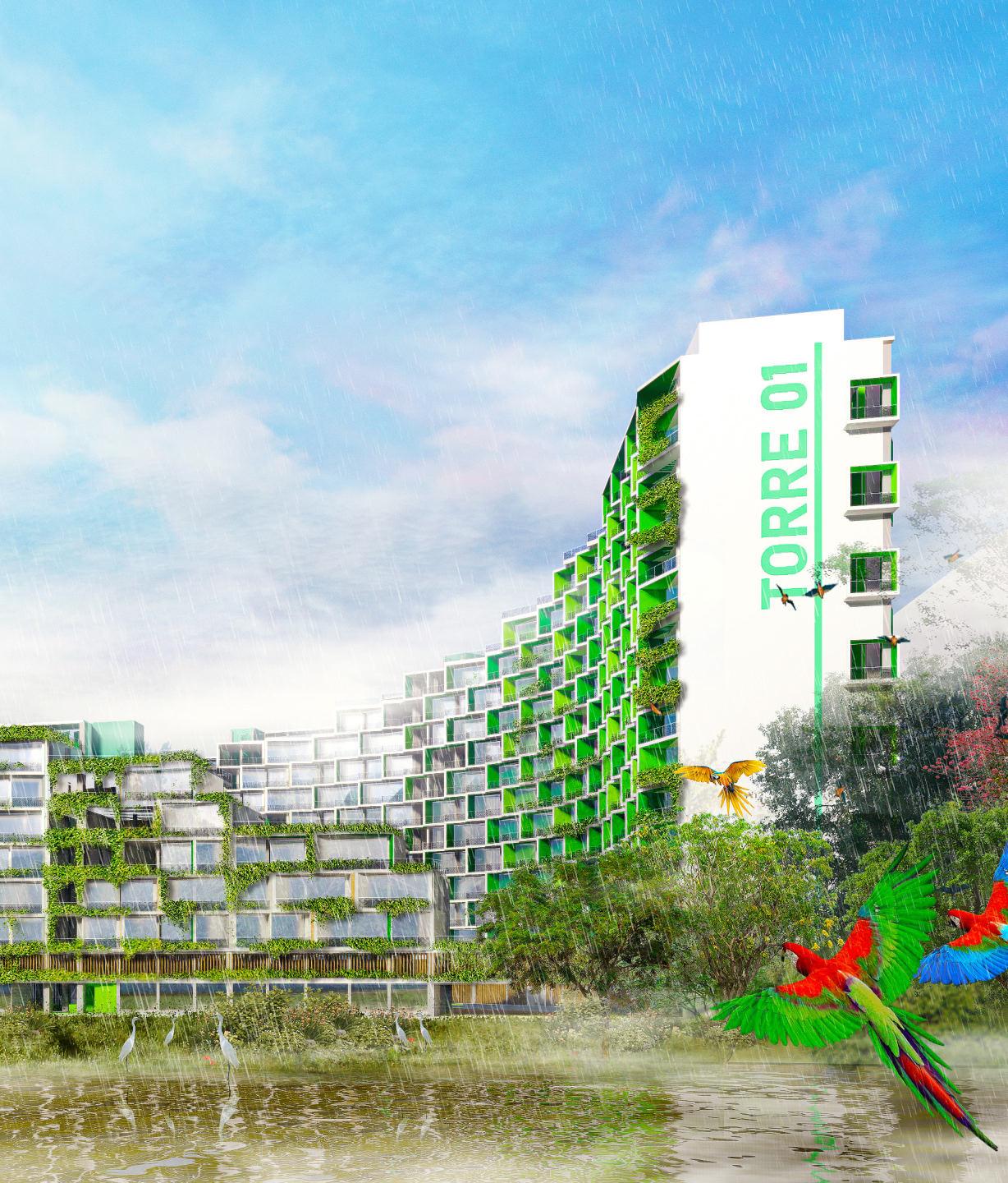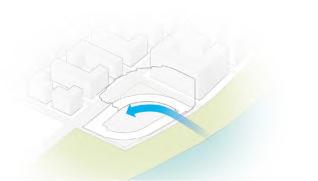 Las cubiertas verdes y los matices de verdes en las fachadas del edificio lo convierten en un elemento que genera un cambio de lo natural a lo urbano.