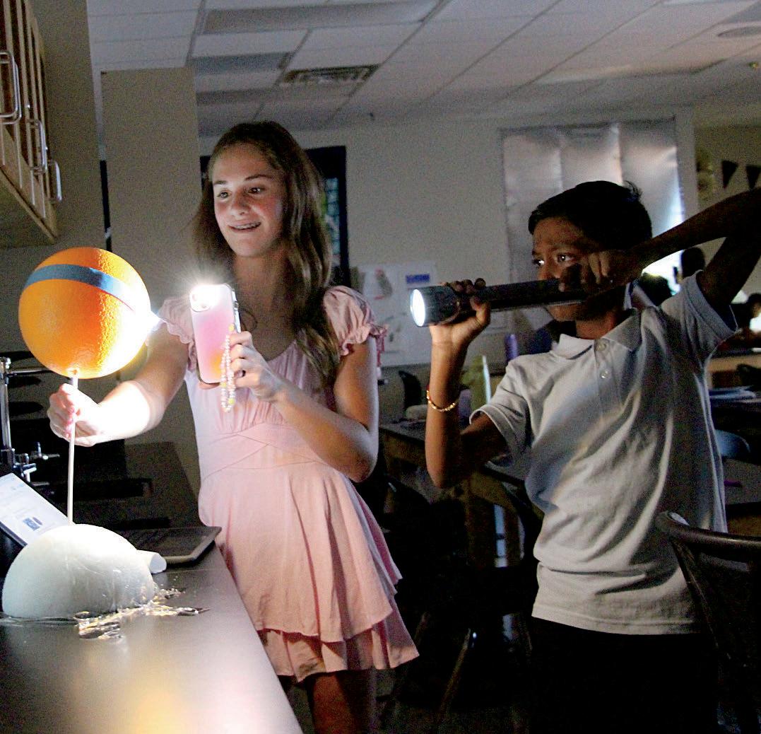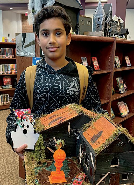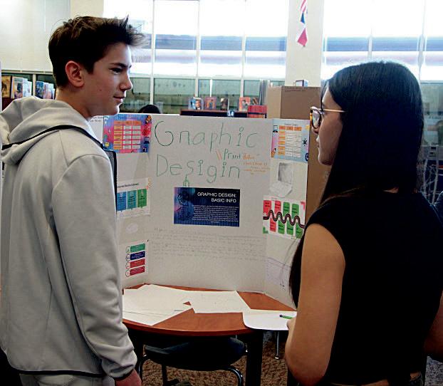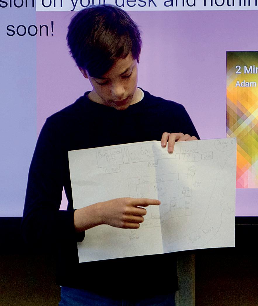 2. Alessandra Rodriguez (7) explains the plan for her project to her friends Haswika Vadde (7) and Noor Nanda (7). 3. Brenden Roche (7) presents his Texas mission project.