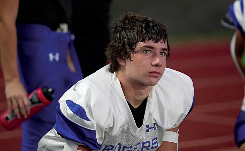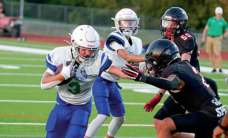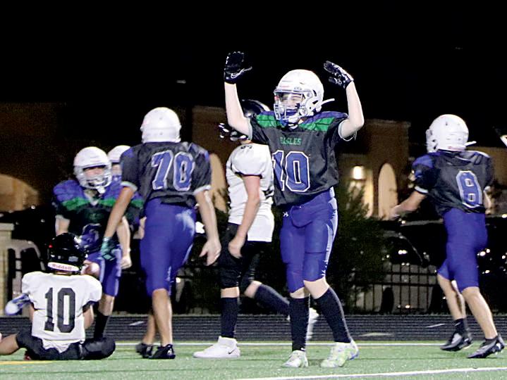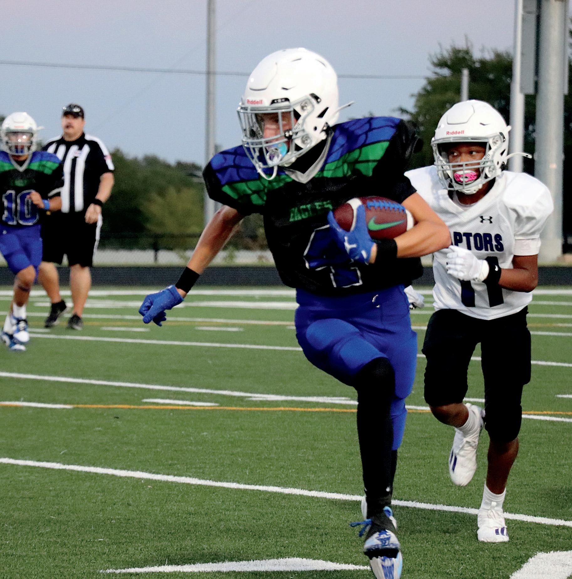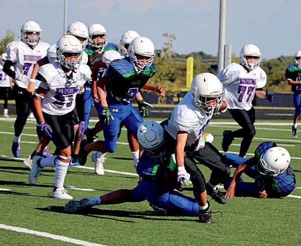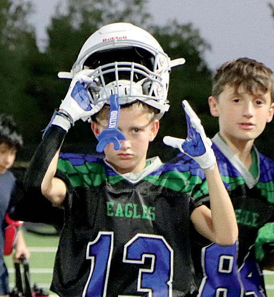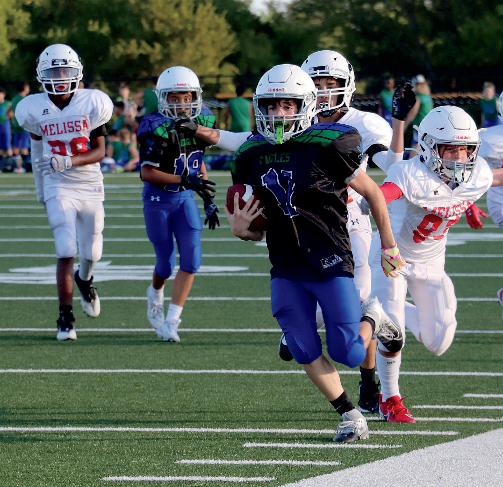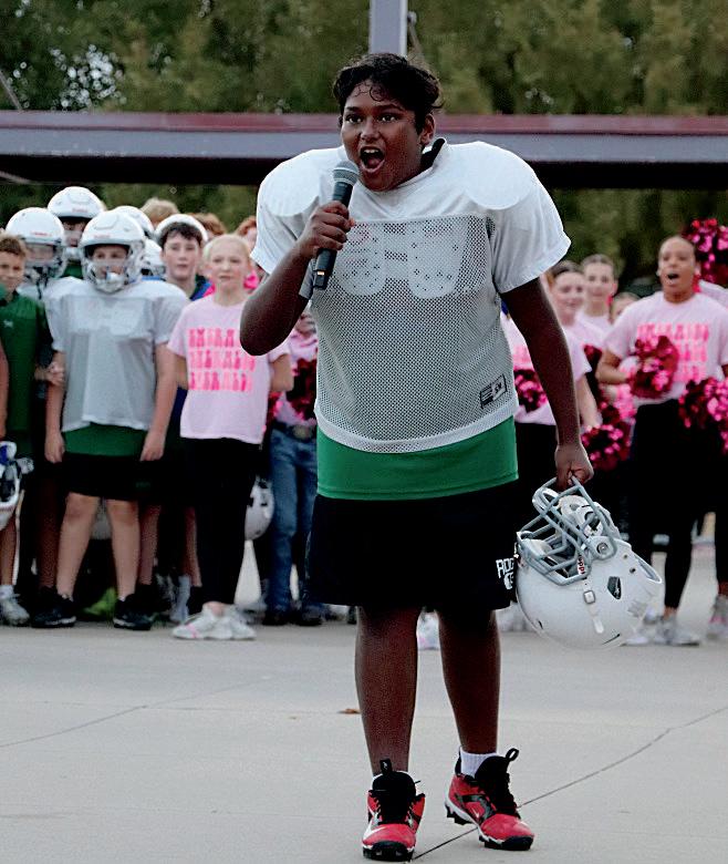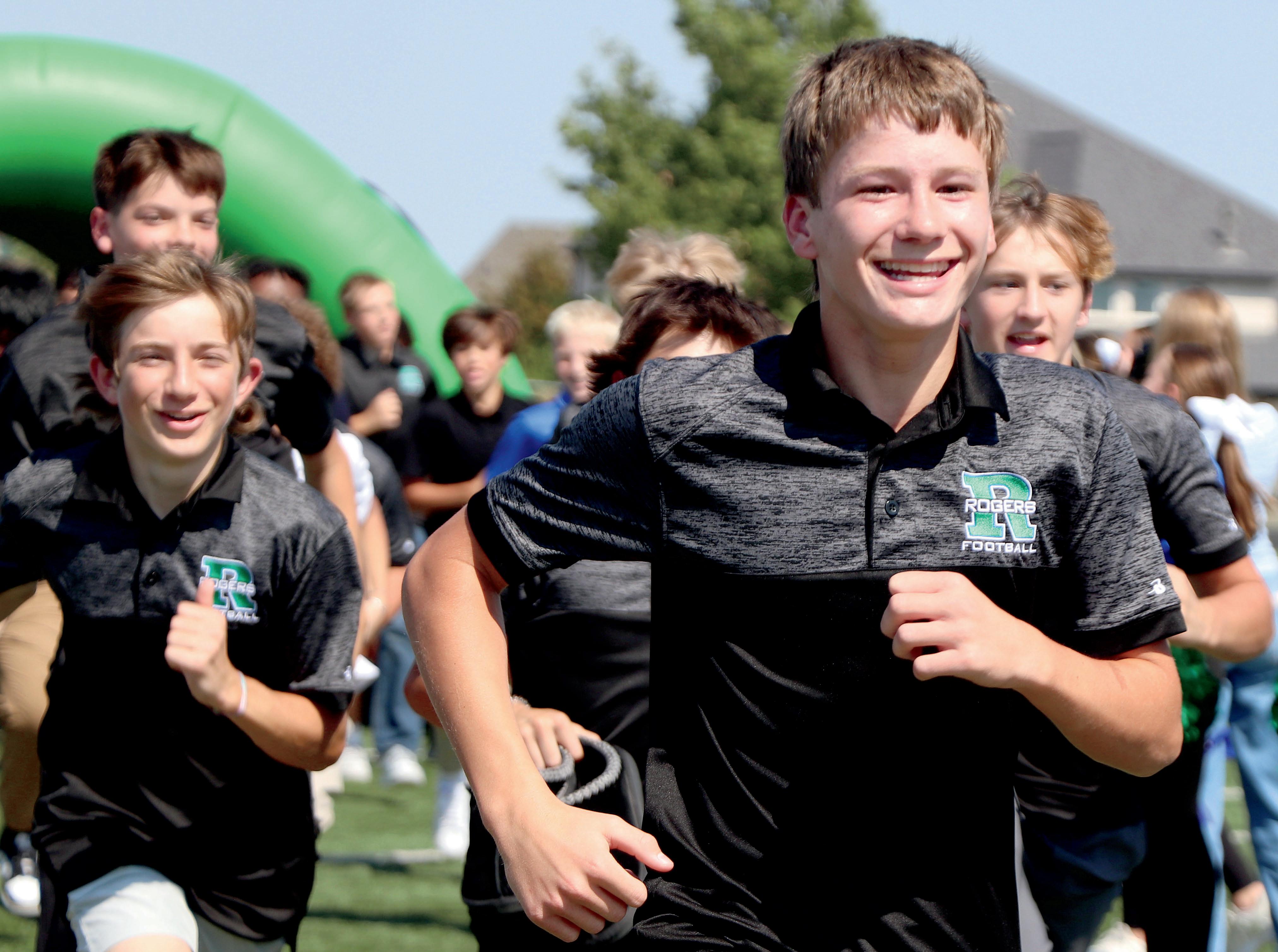 Graham Martin (8), Brody Richards (8), Gage Peel (8), Emmitt Brandvold (8) and the football team run onto the field at the pep rally.