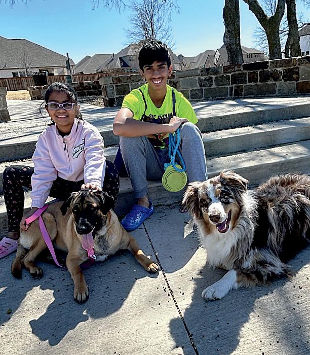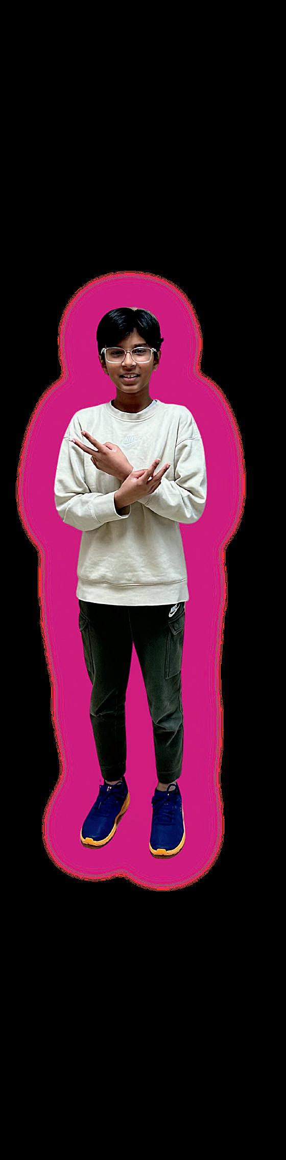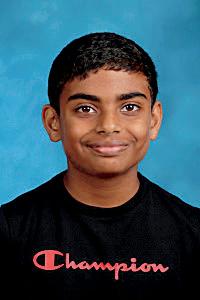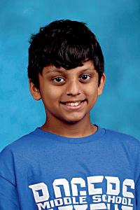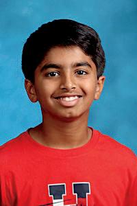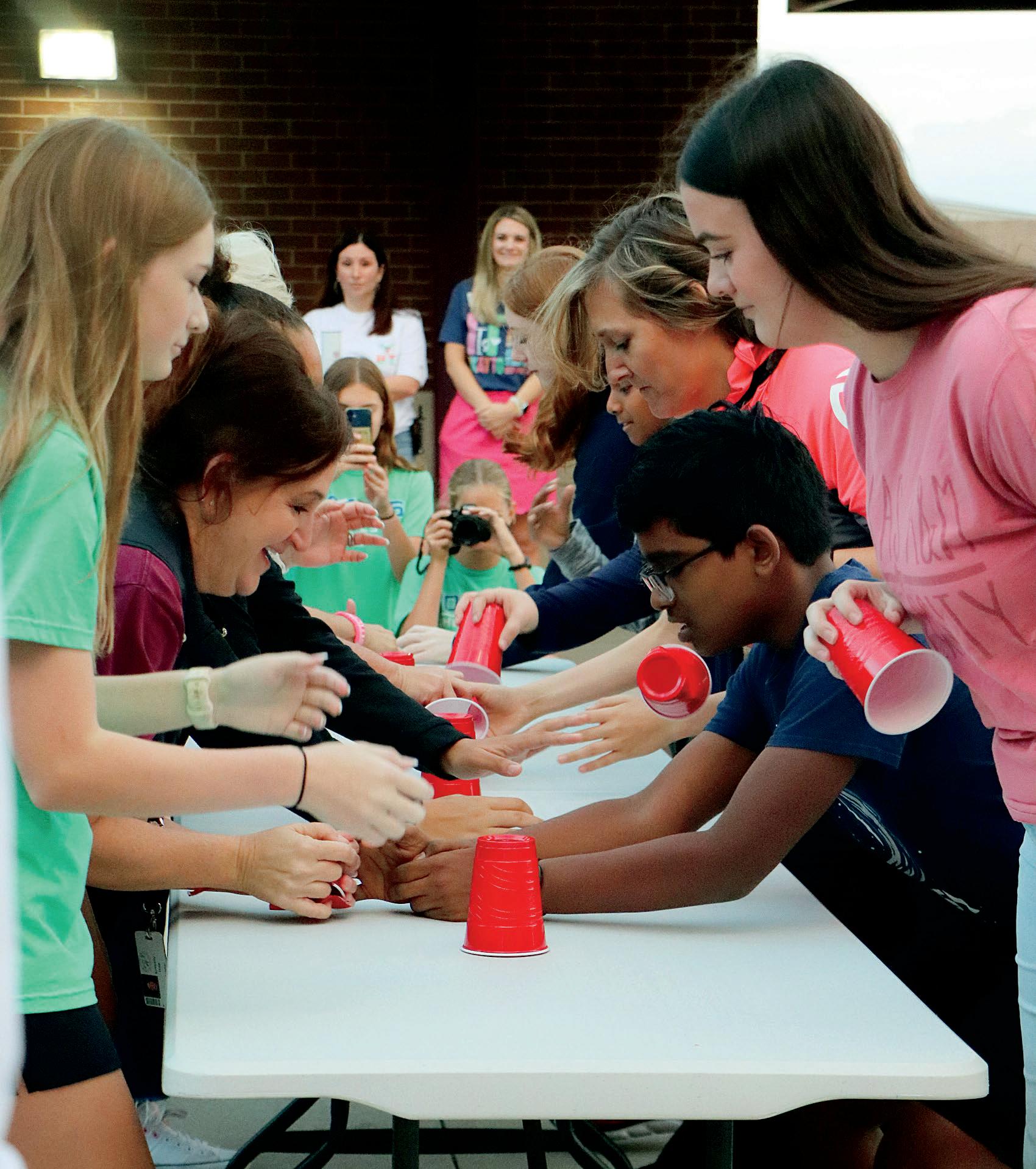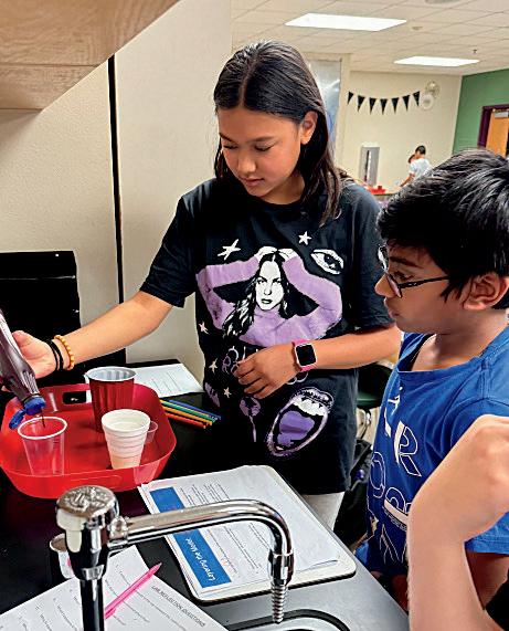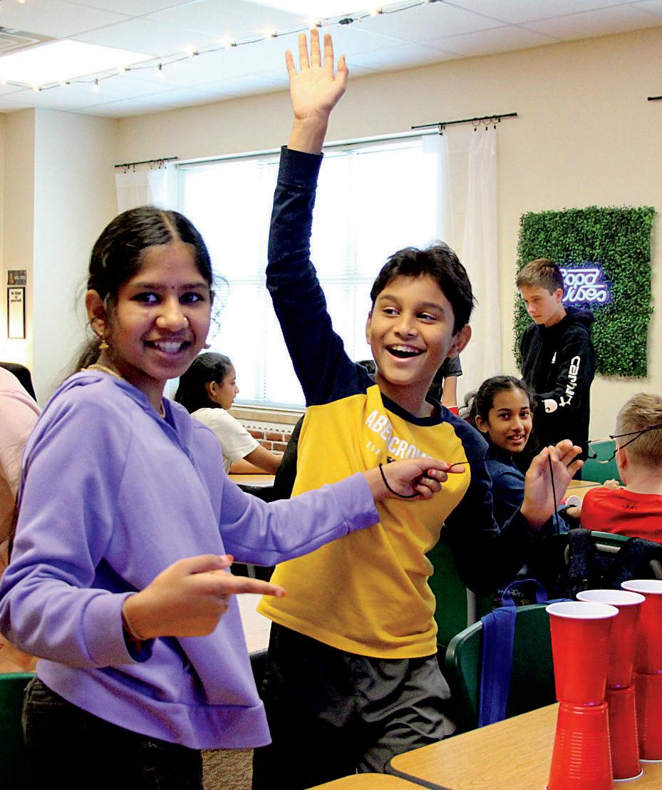 3. Rushil Abburi (7) and Jhanvi Dixith (7) celebrate after winning a cup stacking challenge.