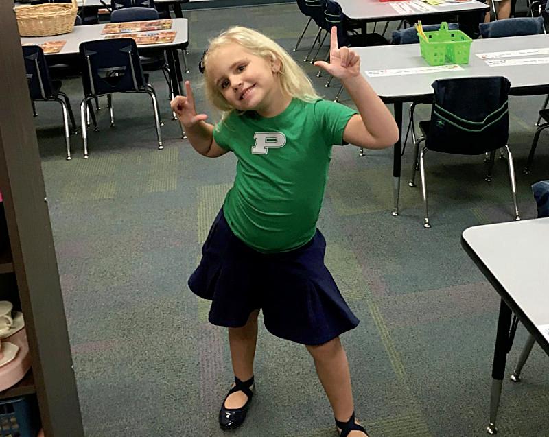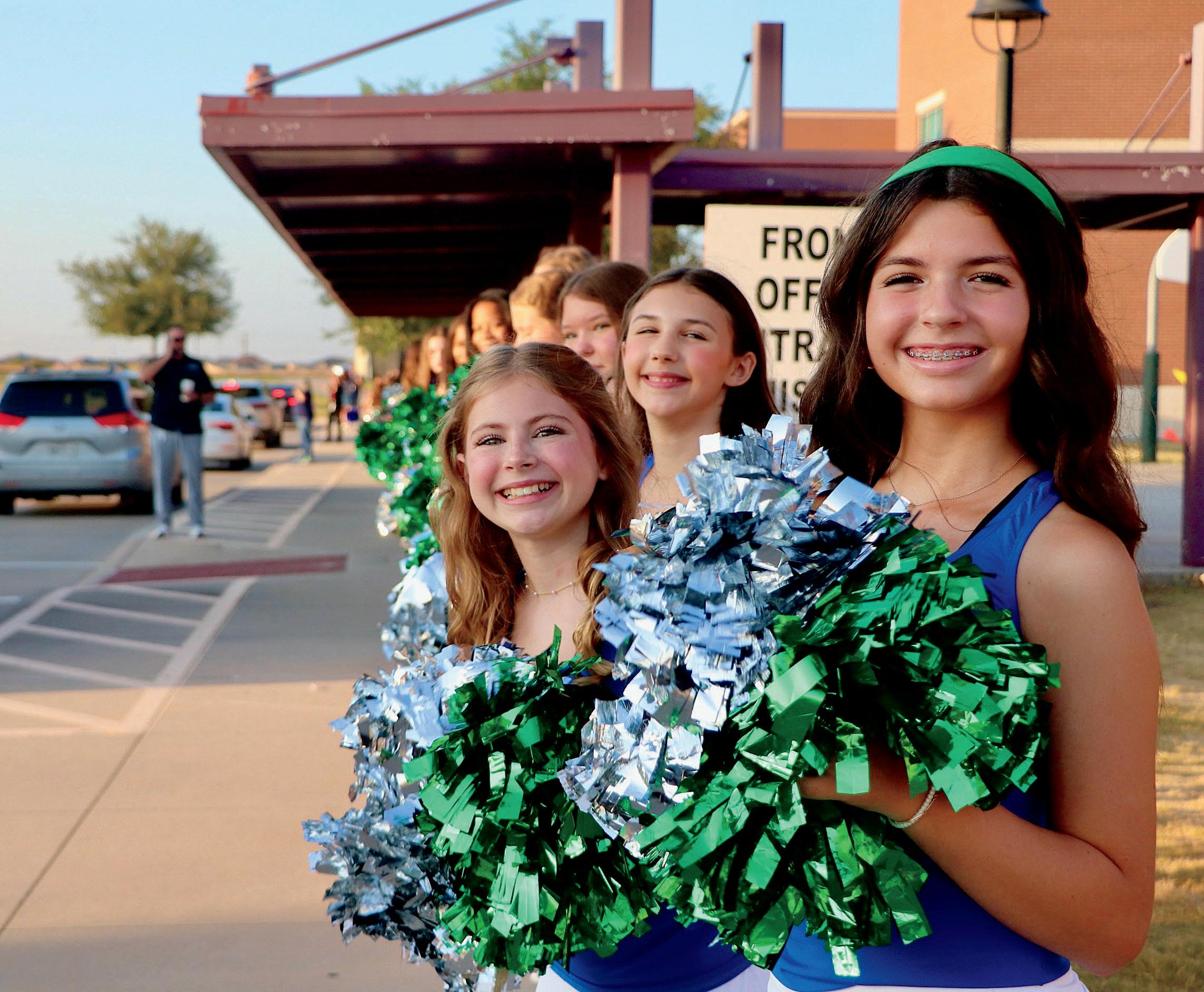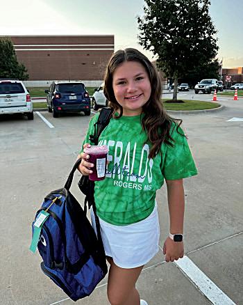 Rogers Emeralds Maddyn Toth (7), Harper Hise (7) and Alivia Jetton to bring spirit for the students getting out of the car on the first day of school.