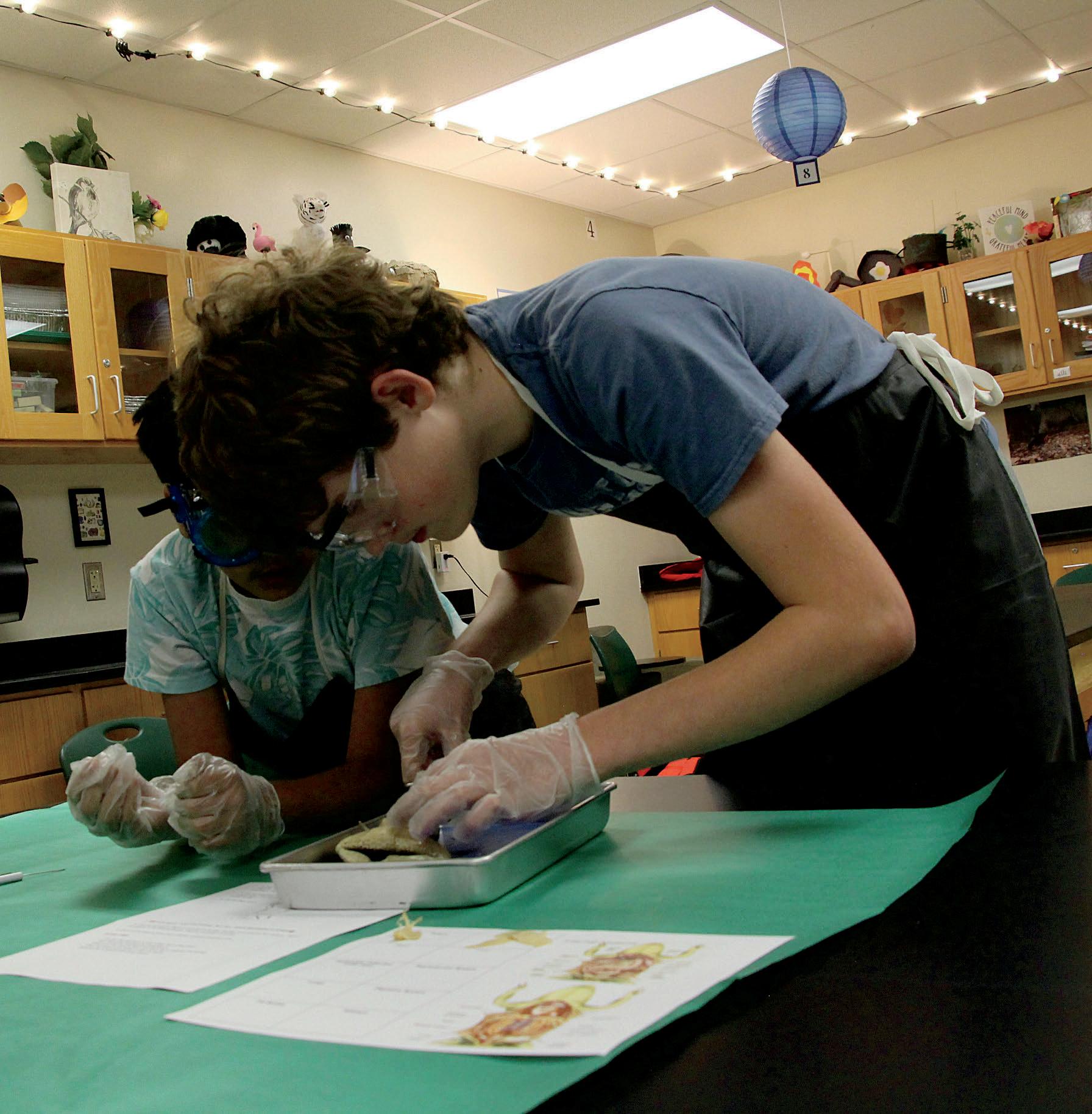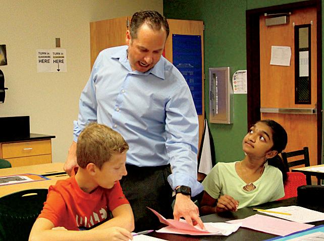 2. Anthony Xanthos (6) and Krishithaa Nithyanandan (6) listen closely to Mr. Rammos