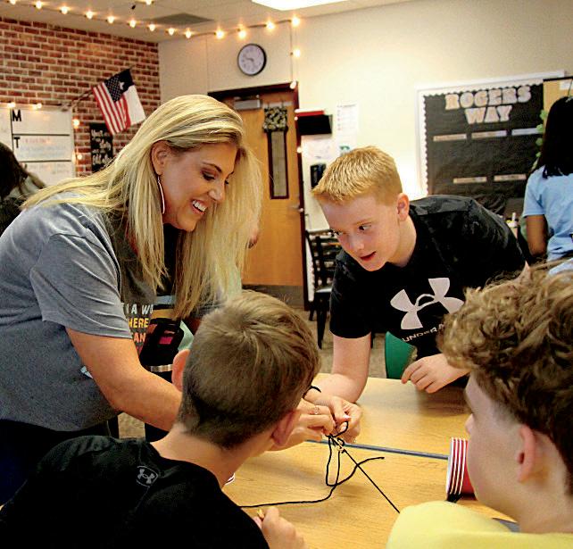 1. Mrs. Mestayer plays a fun icebreaker game with James Rowland (7) and a group of students.