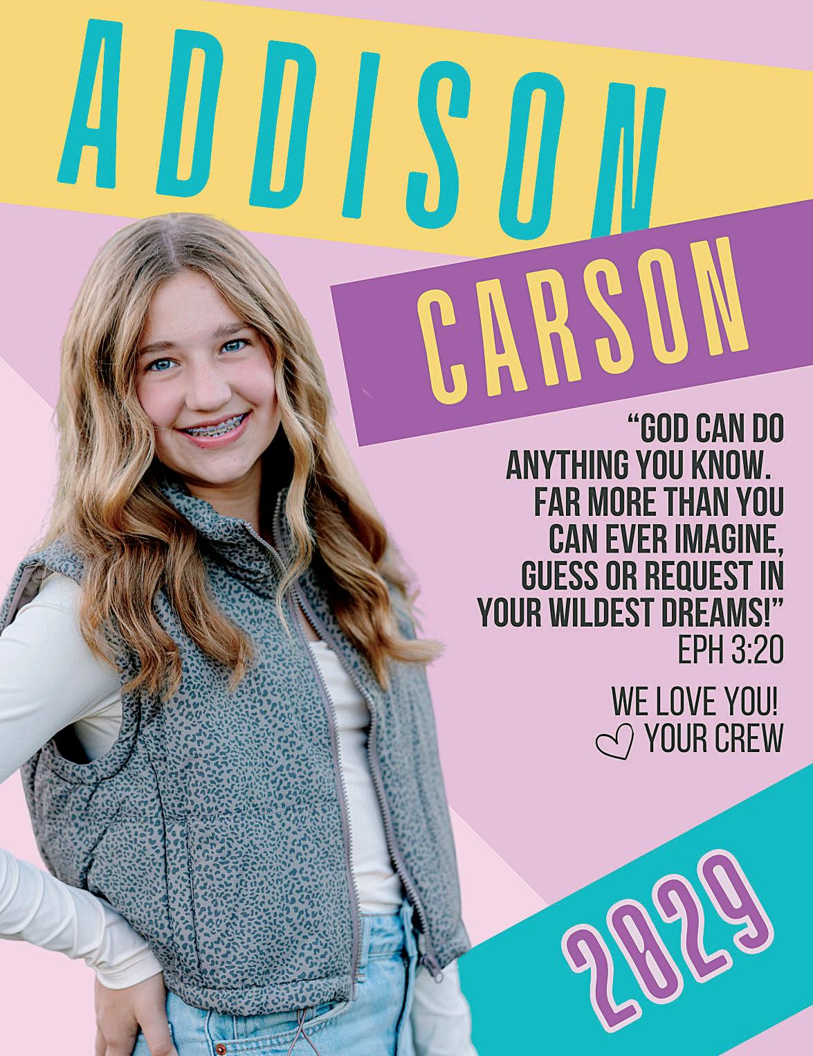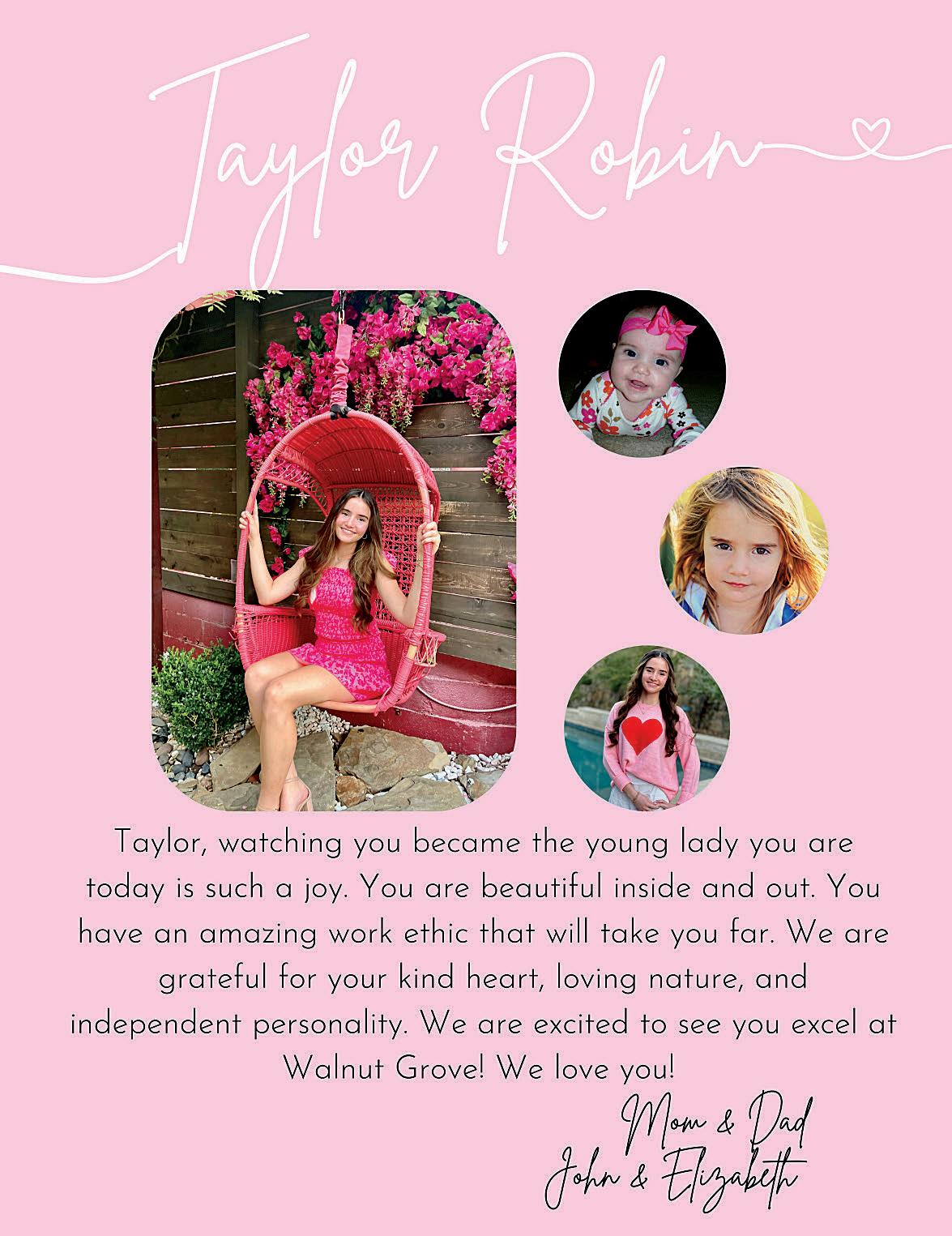 We are so proud of the smart, kind and amazing young lady you've become through your middle school years! As you step into high school, remember to stay true to yourself, dream big and believe in your incredible potential. We can't wait to see what the next chapter holds for you!