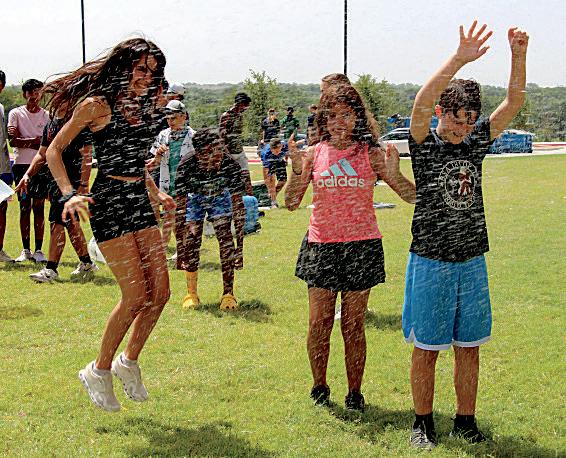 Students run through the sprinkler at band camp.