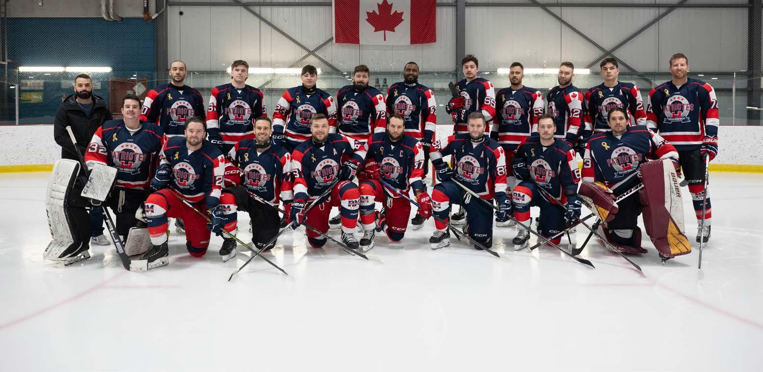 The Patriotes junior hockey team. Back row: Master Corporal Alexandre Turcotte and Master Corporal Tyler Happeney from the Canadian Forces Leadership and Recruit School (CFLRS); Officer Cadets Émile Rioux and Étienne De Roy from Royal Military College Saint-Jean (RMC Saint-Jean); Captain Frédéric Thouin from Montreal Garrison Operations Centre; Master Corporal Mahmoudou Baldé from the 2 nd Canadian Division Support Group (2 CDSG) Information Technology Services; Master Corporal Kobe Skidders from the 2 CDSG Technical Services; Sergeant Alex Lapierre and Corporal Olivier Laperle from CFLRS; Officer Cadet Louis Russell from RMC Saint-Jean; and Sergeant Maxime Léger from CFLRS. Front row: Lieutenant (Navy) Kenton Carmody from RMC Saint-Jean; Sailor 1 st Class Samuel David, Sergeant Nathaniel Jutras, Master Corporal Phillip Labbé and Sergeant Samuel Desjardins from CFLRS; Master Sailor Samuel Duquette and Officer Cadet Antoine Montpellier from RMC Saint-Jean; and Corporal Paul Jr. Bourbeau from the 2 CDSG Technical Svcs.