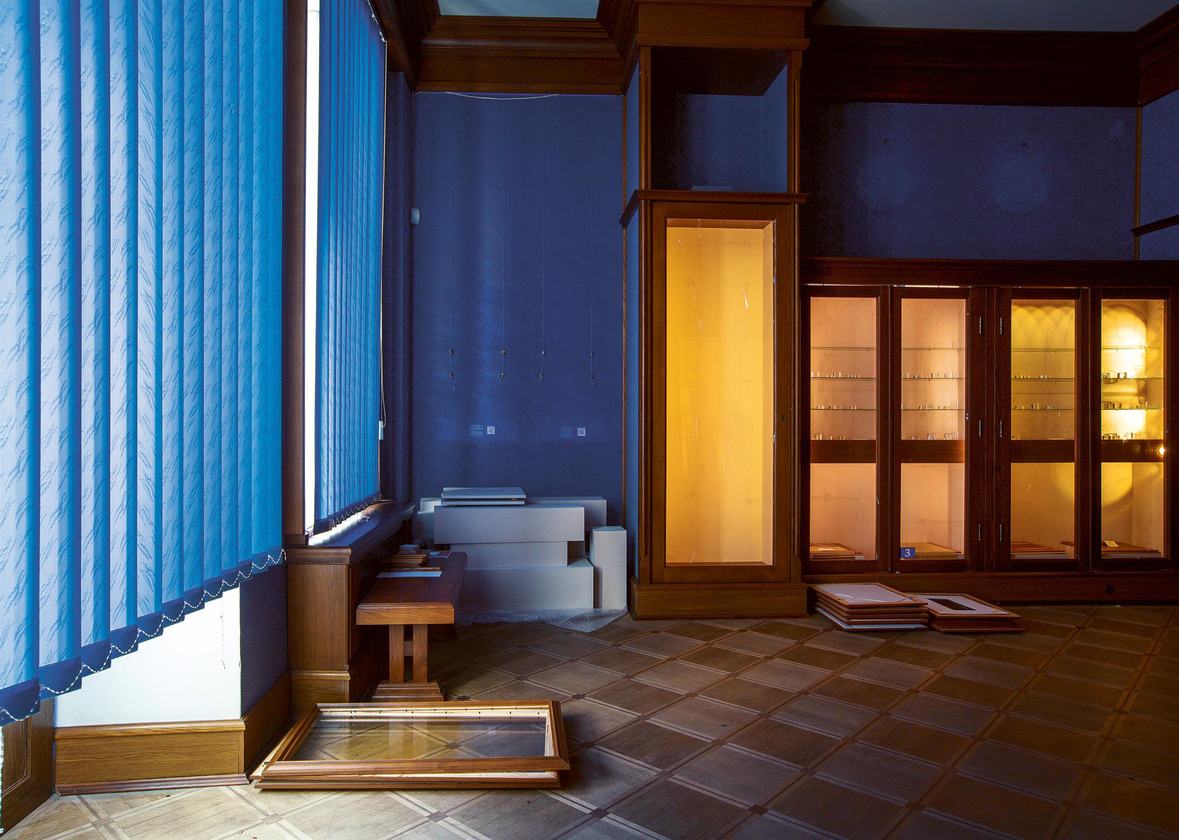 Das Bohdan and Varvara Khanenko National Museum of Arts in Kyiv beherbergt eine herausragende Sammlung europäischer, asiatischer und islamischer Kunst, die das Sammlerehepaar Bohdan und Varvara Khanenko in ihrer Stadtvilla zusammentrugen und der Stadt und ihren Bürger*innen testamentarisch vermachten. Mit Aus bruch des russischen Angriffskriegs wurden, wie zuletzt im Zweiten Weltkrieg, große Teile der Sammlung evaku iert. Im Rahmen der Ausstellung „Spurensicherung“ prä sentiert die Akademie der Künste 14 Fotografien von Yurii Stefanyak. Sie zeigen menschenleere Säle, auf denen sich schemenhaft die Umrisse der Gemälde auf den sei denen Tapeten abzeichnen, ausgeräumte Vitrinen und Sockel – den Körper eines ruhenden Museums, das bar seiner Schätze nur mehr als Hülle fungiert.