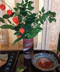 1. Décoration rituelle d’un hall d’accueil dans une entreprise à Paris : bois naturel et enduit aspect terre pour les murs. Rouleau peint : paysage symbolique et mont Fuji. Socle en bois pour pot ou bouquet de fleurs.