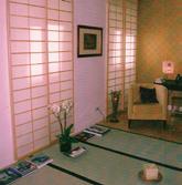 Décor traditionnel et agencement moderne : panneaux coulissants translucides shoji, tatami en vraie paille et bouquet de fleurs.