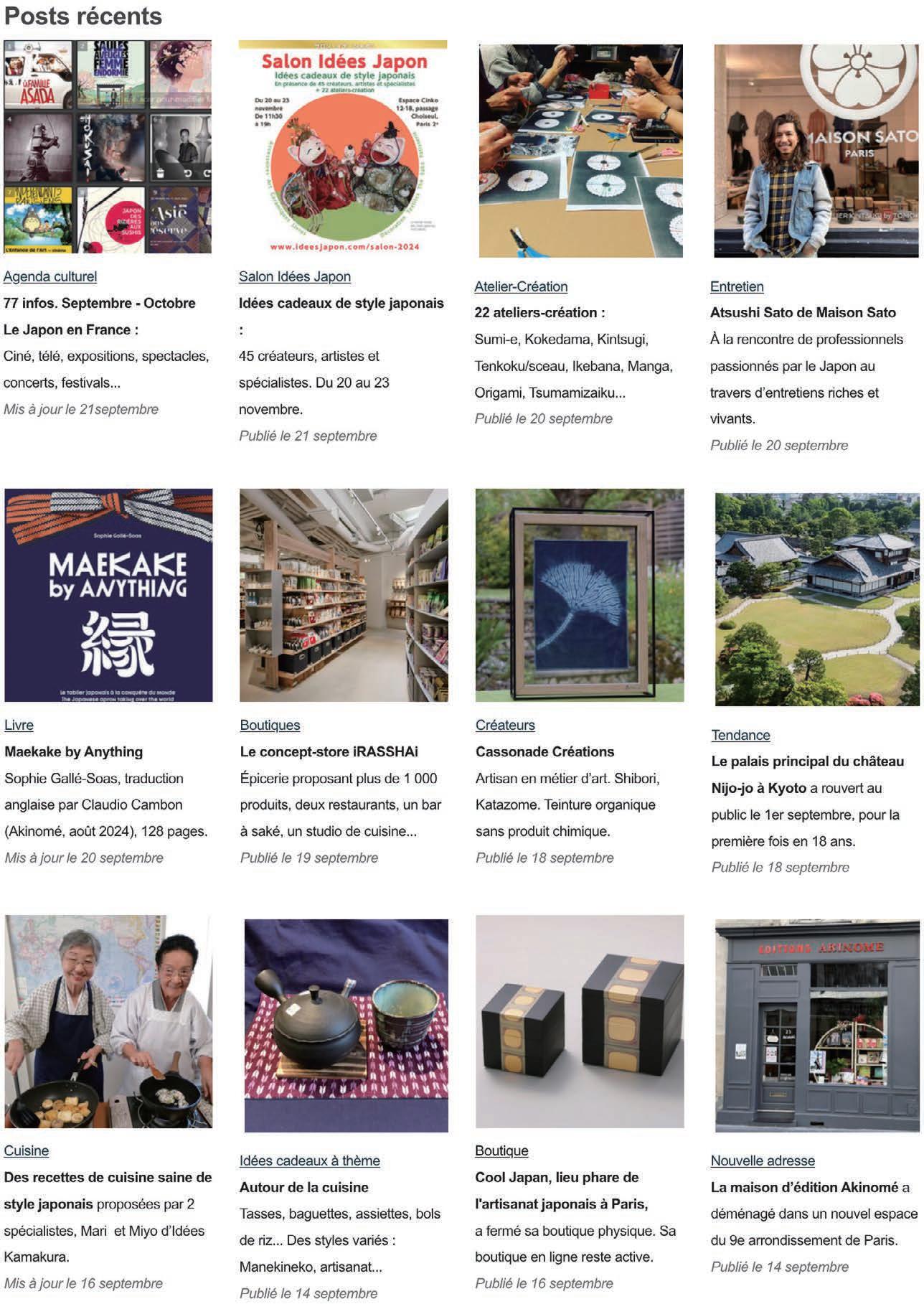 vous fait découvrir le Japon en France à travers des informations variées : Agenda culturel, Livres, Nouvelles adresses, Cuisine, Tendances/Voyage, Restaurants, Carnet d'adresses, Boutiques, Idées cadeaux de style japonais... Les informations sont renouvelées toutes les semaines.