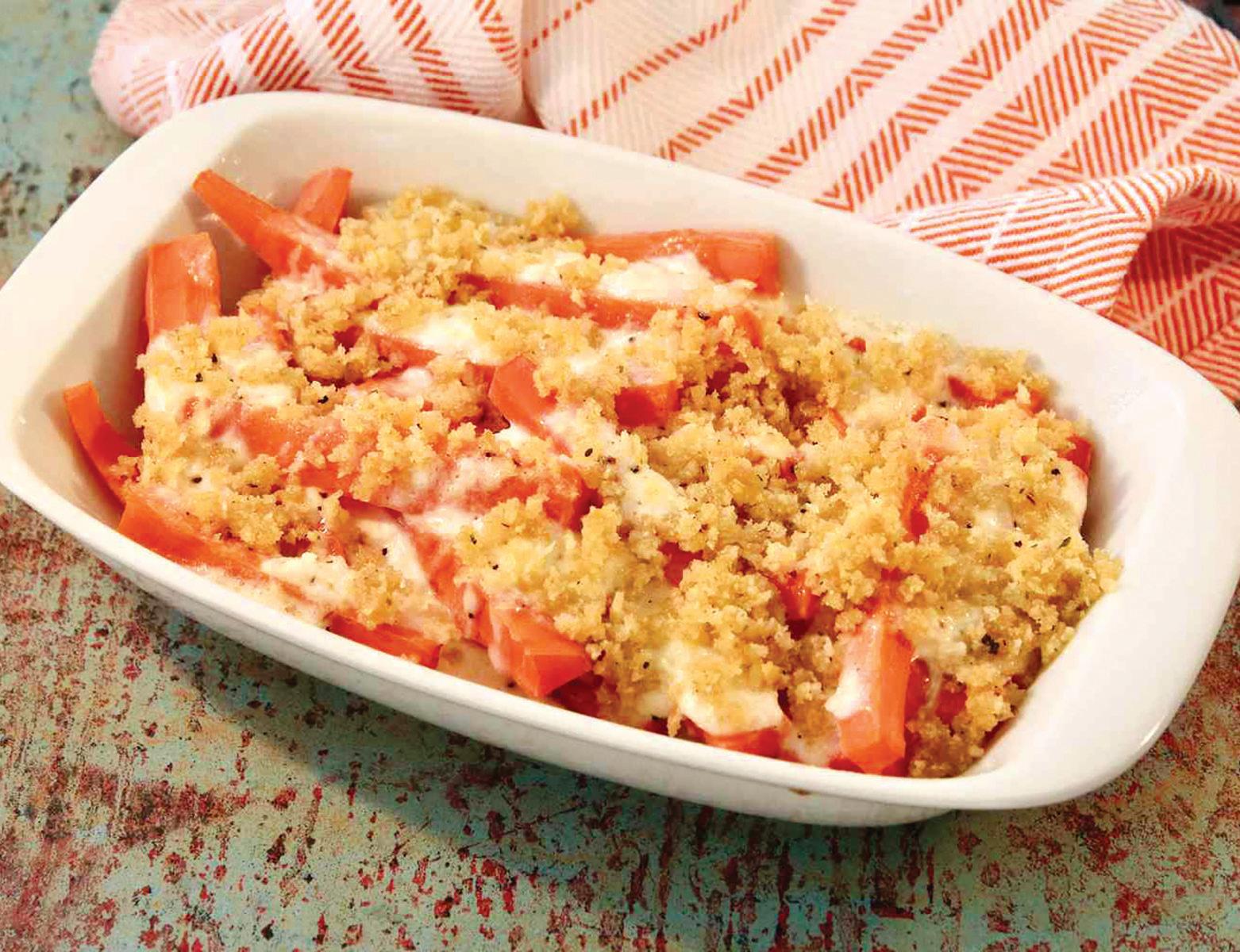 In a blender, puree a package of thawed vegeta bles and an egg. Combine it with ground chicken. Spread a layer of panko breadcrumbs on a baking sheet, and flatten the chicken mixture over the top.