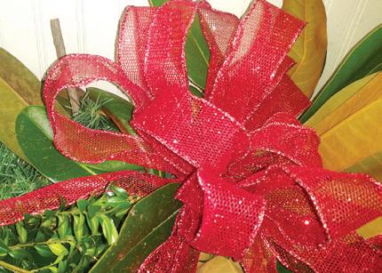 When I go to tie a bow, I look at the wreath or gar land that it goes on and think about how big the loops should be. I take the ribbon and make loops back and forth in my hand according to how many I want, and then leave about four inches more and cut the ribbon. Then the tying begins.