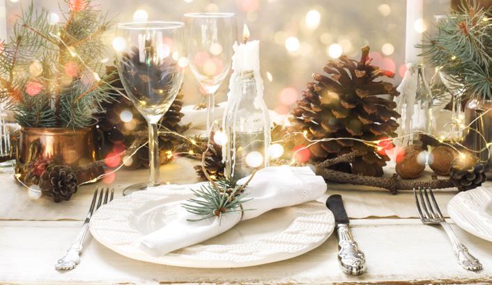 For a New Year’s Eve vibe, try to find shiny metallics — espe cially silver or gold — or glitter ribbon. You can hang it from light fixtures, doorways, lamps, mantels, or even on the bathroom mirror or straight down from the ceiling. Scatter a few curls to decorate your buffet as well.