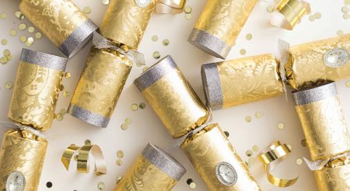 Just gather up some toilet paper rolls, latex balloons, tape, and leftover wrapping paper. Tie a knot in the end of a latex balloon, and snip the balloon in half. Wrap double-sided tape around the bottom of a toilet paper tube, then stretch the knot ted half of the cut balloon over it. Decorate the tube using your wrapping paper of choice, and put a small handful of confetti inside. (If you don’t have confetti, you can make your own us ing any paper and a hole punch or crosscut shredder.) If desired, cover the open end of the tube with more wrapping paper to hold in the confetti until it’s time. At midnight, remove the cov er, pull the knotted end of the balloon backward, release it, and watch the confetti explode from the tube. Get the full instruc tions on Thrifty & Crafty.