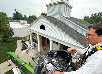 Though Dulsky craves the heights, he recognizes the dangers and takes considerable precautions in his work. He has his own manlift designed for getting up close on church properties without being damaging. It reaches to heights of 70 feet with an outreach of 40 feet. For further distances, he uses rope.