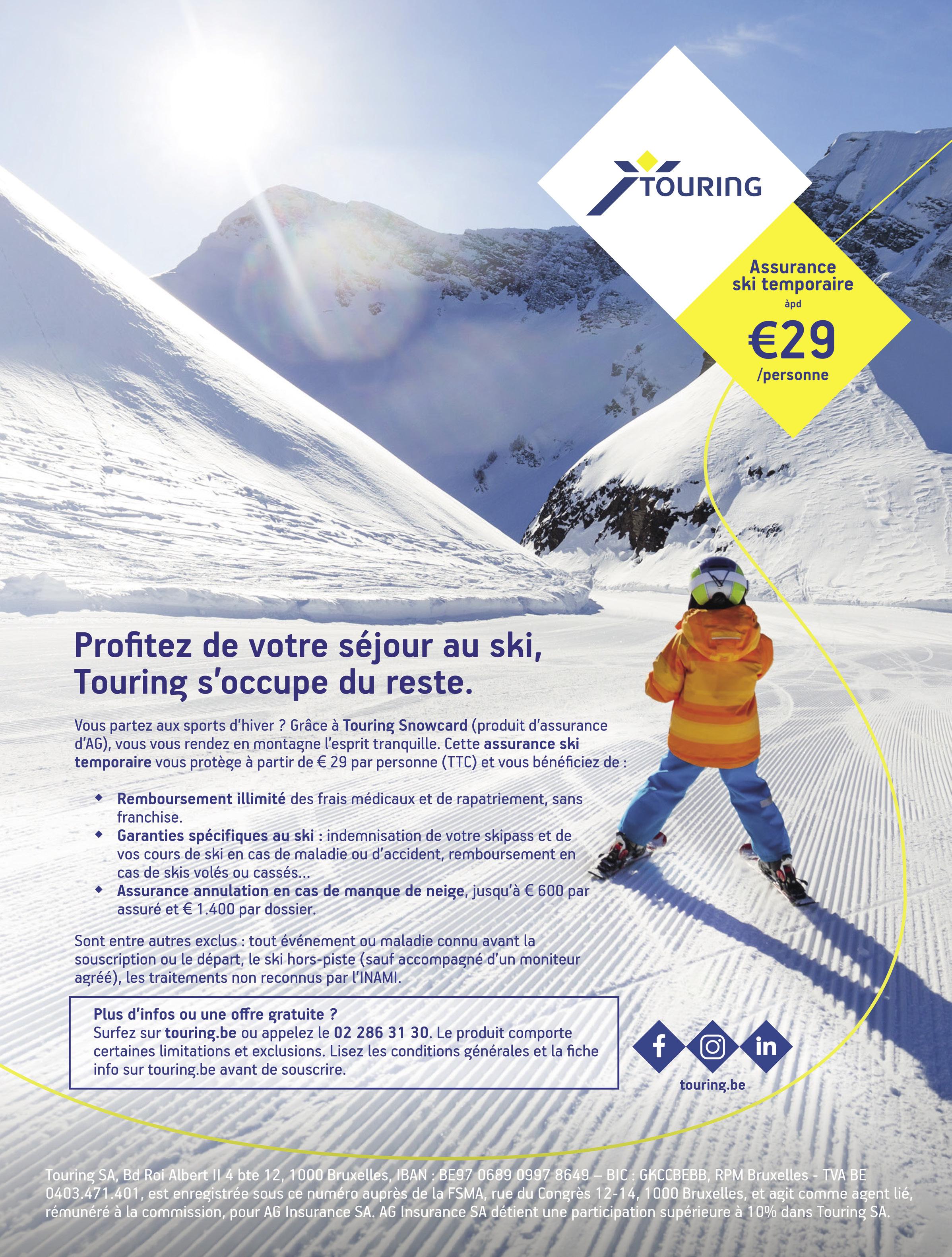 Astuce: Veillez à vous munir de la Touring Snowcard (produit d'assurance d'AG), une assurance voyage taillée sur mesure pour les vacances aux sports d'hiver. Lisez au préalable la fiche info sur www.touring.be/fr/produits/ assurance-ski