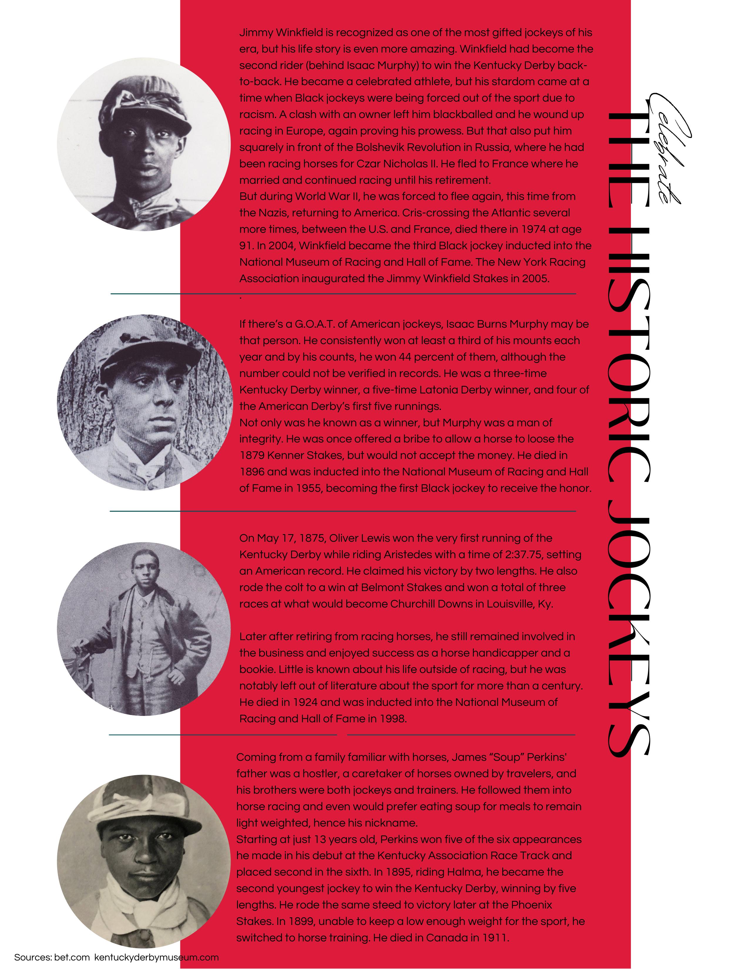 focus on the winning steeds and the jockeys who ride them. But there is an important history, often overlooked, of Black jockeys at the Derby who had a winning track record not only there but at many popular race courses.