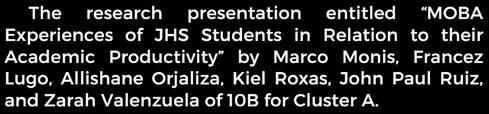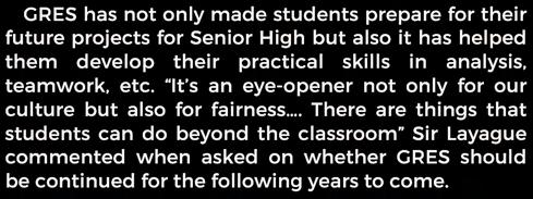 The JHS Principal, Mrs. Grace Marie B. Martin, indulged the fellow Rizalians and thanked everyone who participated in the event. A day filled with entertainment was served with the String and Glee Club performing a lively intermission to brighten the occasion. The Mathematics Department also welcomed a former pupil who is now a well-known singer Illest Morena to perform someofherbesthitsonitslastday.Through herinteractionswiththestudents,IllestMorenaliftedeveryone'sspirits.
