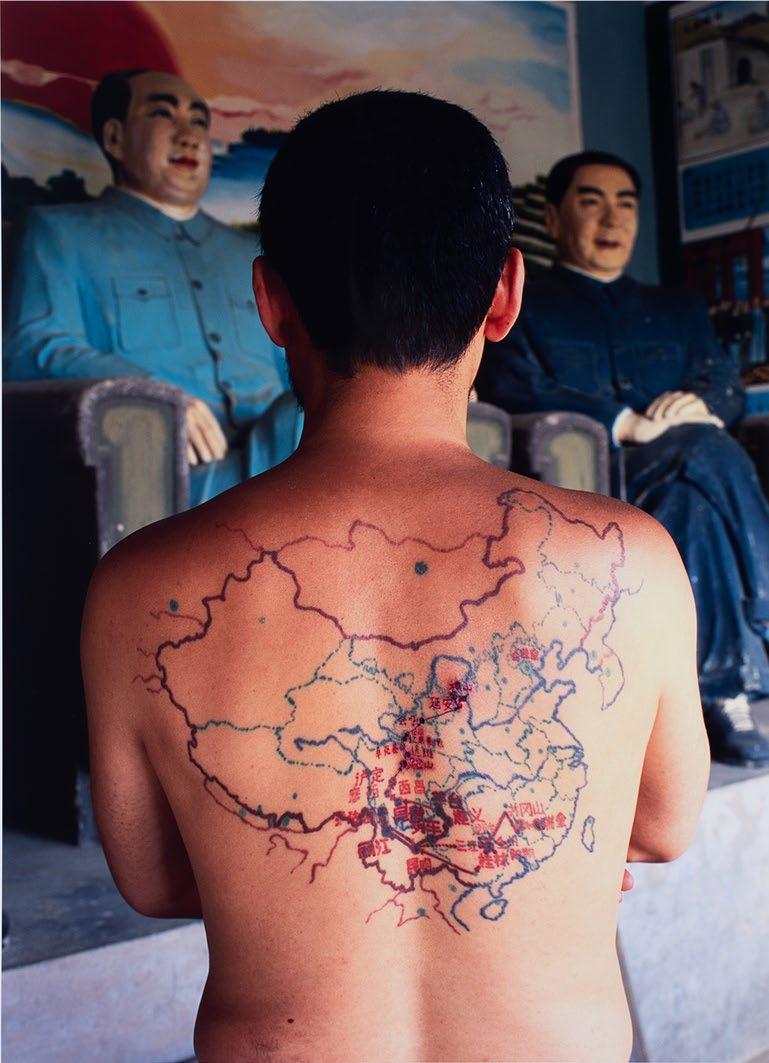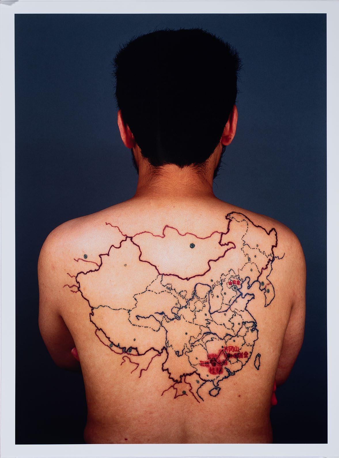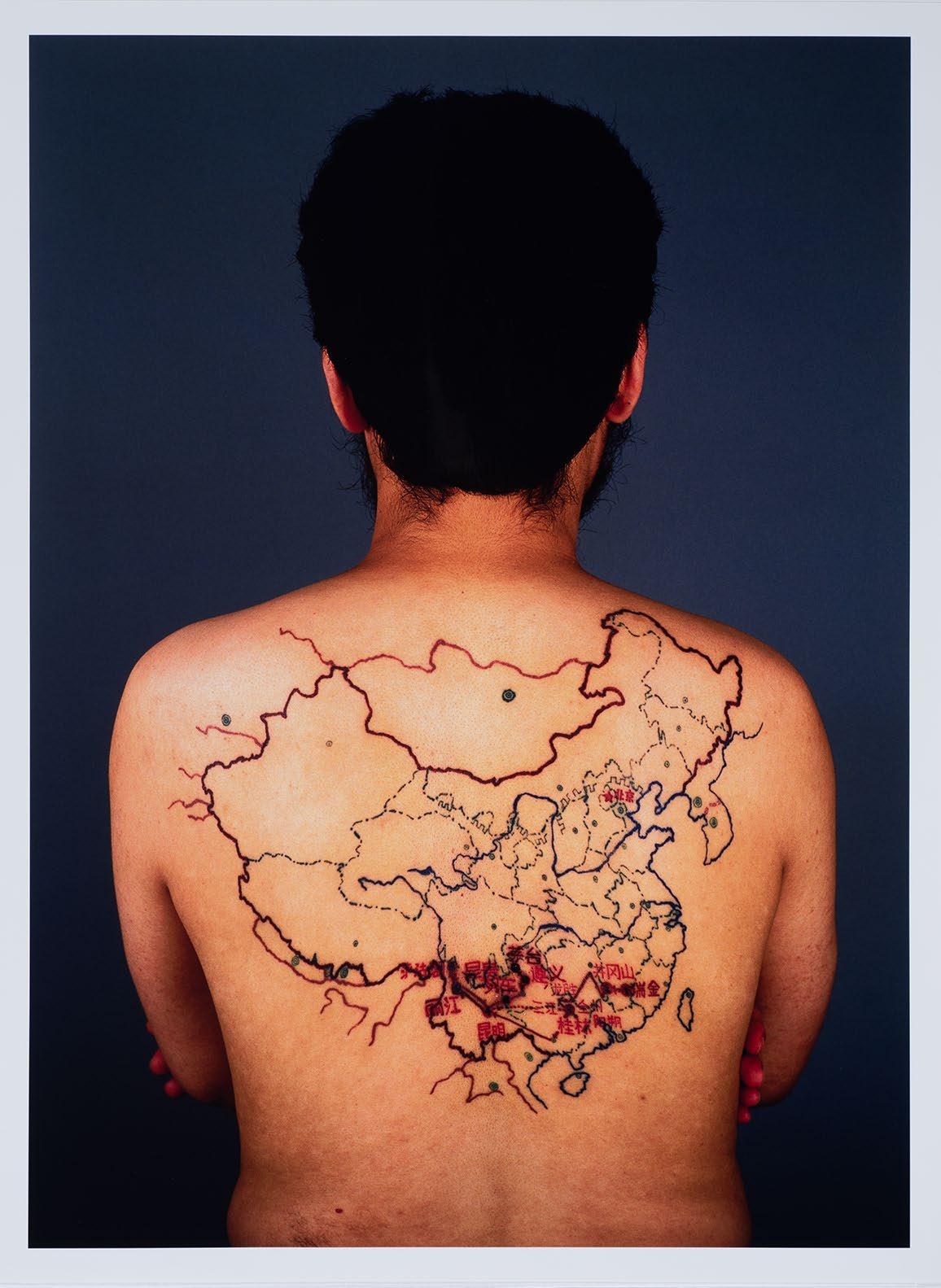While still a student, Qin Ga participated in the initial phase of The Long March Project, a contemporary art collective founded by Lu Jie (卢杰) and Qiu Zhijie (邱志杰 ) that began with “ The Long March Project— A Walking Visual Display,” which sought to explore revolutionary memory by retracing the Red Army’s 1934-35 Long March with various planned performances and displays at sites along the historic route. Qin Ga did not physically accompany the travelers. Instead, he maintained contac t with them, marking their progress by tattooing the name of each successive destination on the map of China he had inscribed on his back for the purpose, and documenting their journey through a series of photos and video to create his Miniature Long March.
