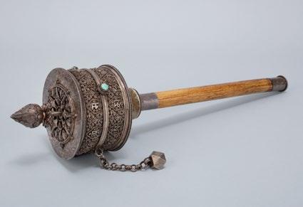 Handheld Prayer Wheel. Central Tibet; Early 20th century. Silver, wood. 19 5/8 x 5 x 4 ½ inches. Rubin Museum of Himalayan Art, Gift of Shelley and Donald Rubin; SC2012.7.2