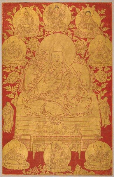 The Fifth Dalai Lama Ngawang Lobzang Gyatso (1617-1682) with Previous Incarnations Central Tibet; 18th century. Pigments on cloth. 25 ¾ x 16 5/8 inches. Rubin Museum of Himalayan Art, Gift of the Shelley & Donald Rubin Foundation; F1996.29.3 (HAR 506)