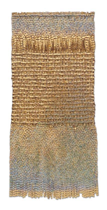 vanessa german (b. 1976 Milwaukee, WI). 7 Beautiful Ni$$As Awe-Struck in the Glory of An Appalachian Sunset , 2022. vintage quilt top, Astro turf, old farm picking fruit basket, getting caught up in the moment, foam tar, black pigment, cowrie shells, seeing your own self reflected in the open evening sky and wondering how anything could be so consistently beautiful and amazing as a sunset, love, gold thread, beaded rhinestone cloth, epoxy, boxing gloves, being speechless in wonder and delight and not having the police f*ck with you at all because they are too busy weeping by your side and clutching their own breast bones to wonder at how the rhythm of their own pattering hearts could match so perfectly the sound of light falling golden out of the sky and into their own open, stupefied maws, rhinestones, yes, yes, yes, 7 muscular wonders. 88 x 30 ½ x 20 inches. Collection of the Jordan Schnitzer Family Foundation. Courtesy of Olney Gleason