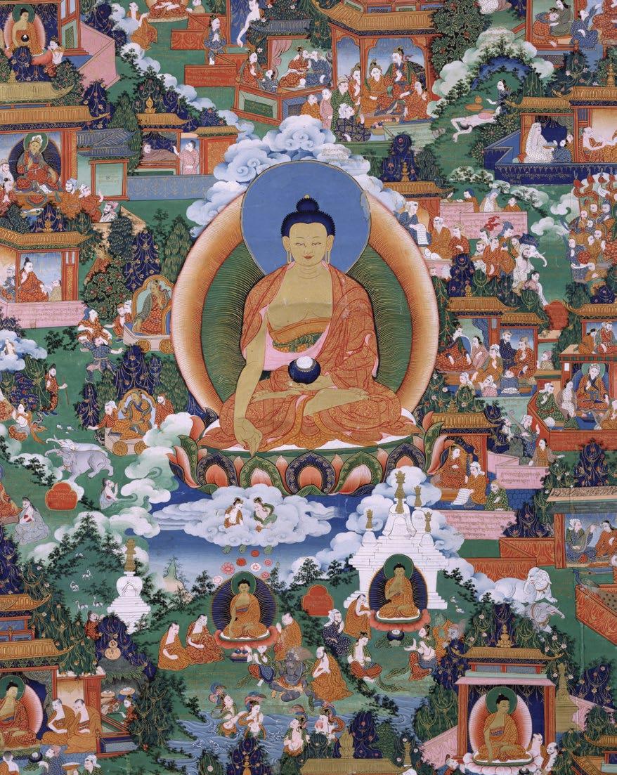 Adjacent page: Buddha Shakyamuni and Teaching Stories (Avadana). Central Tibet; late 18th-19th century. Pigments on cloth. 34 x 22 ¼ inches. Rubin Museum of Himalayan Art. Gift of the Shelley & Donald Rubin Foundation; F1996.27.1 (HAR 494)