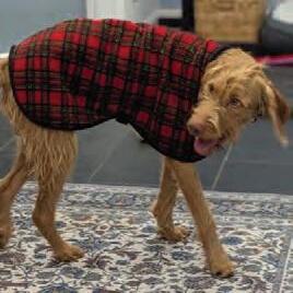 A delight – good in the house, good on lead, she has been fine with other dogs she has met when out, she just loves people, travels well in the car. Fine being left for a few hours. She loves cuddles and snuggles on the sofa.