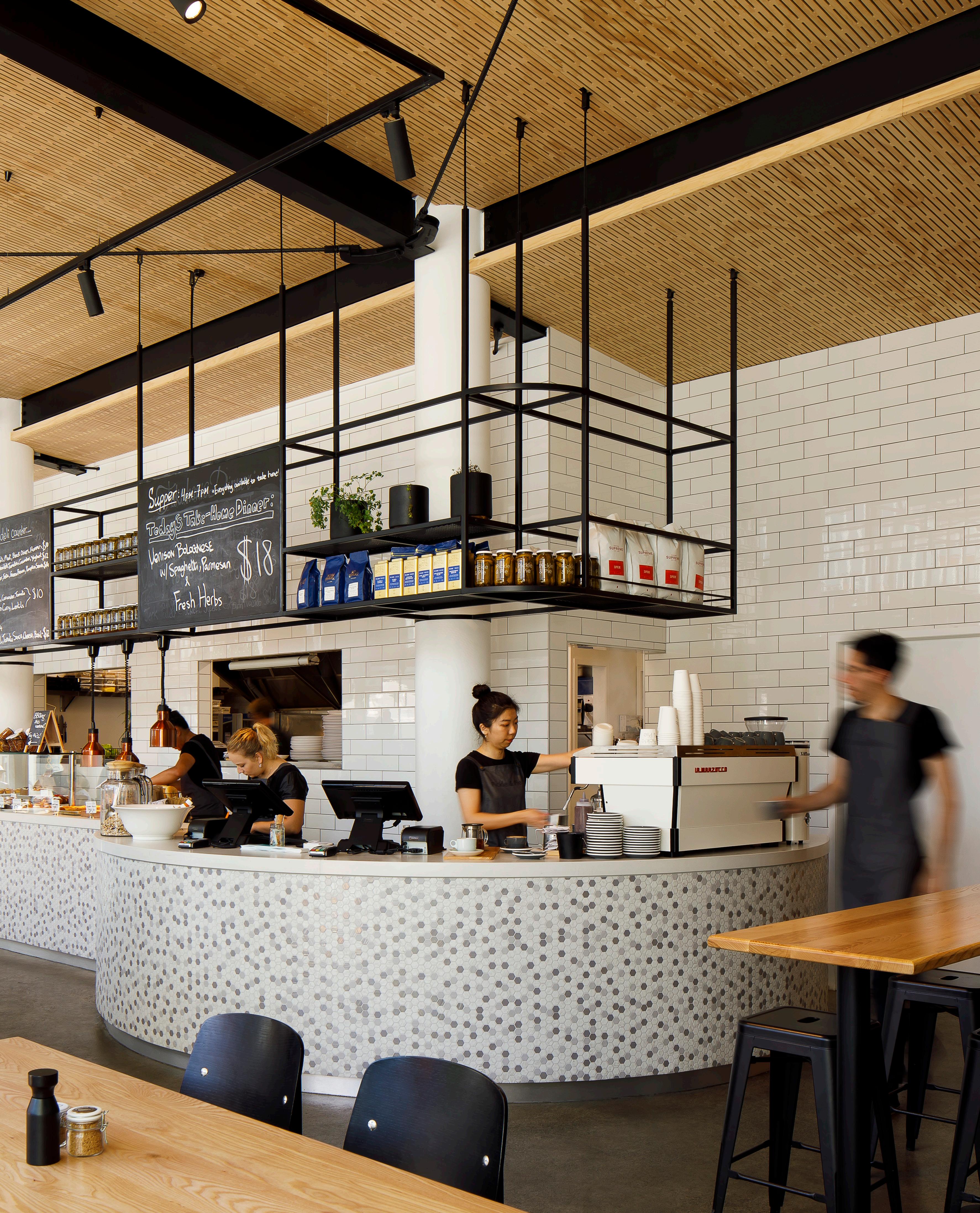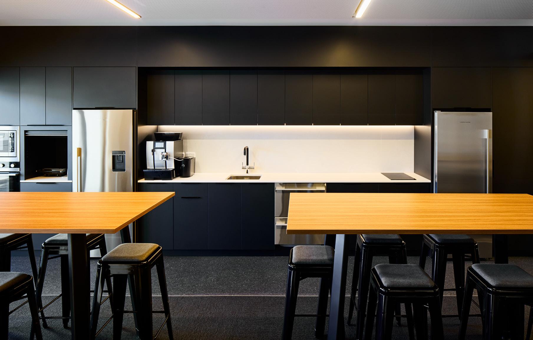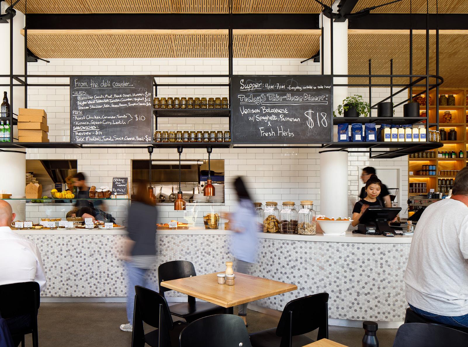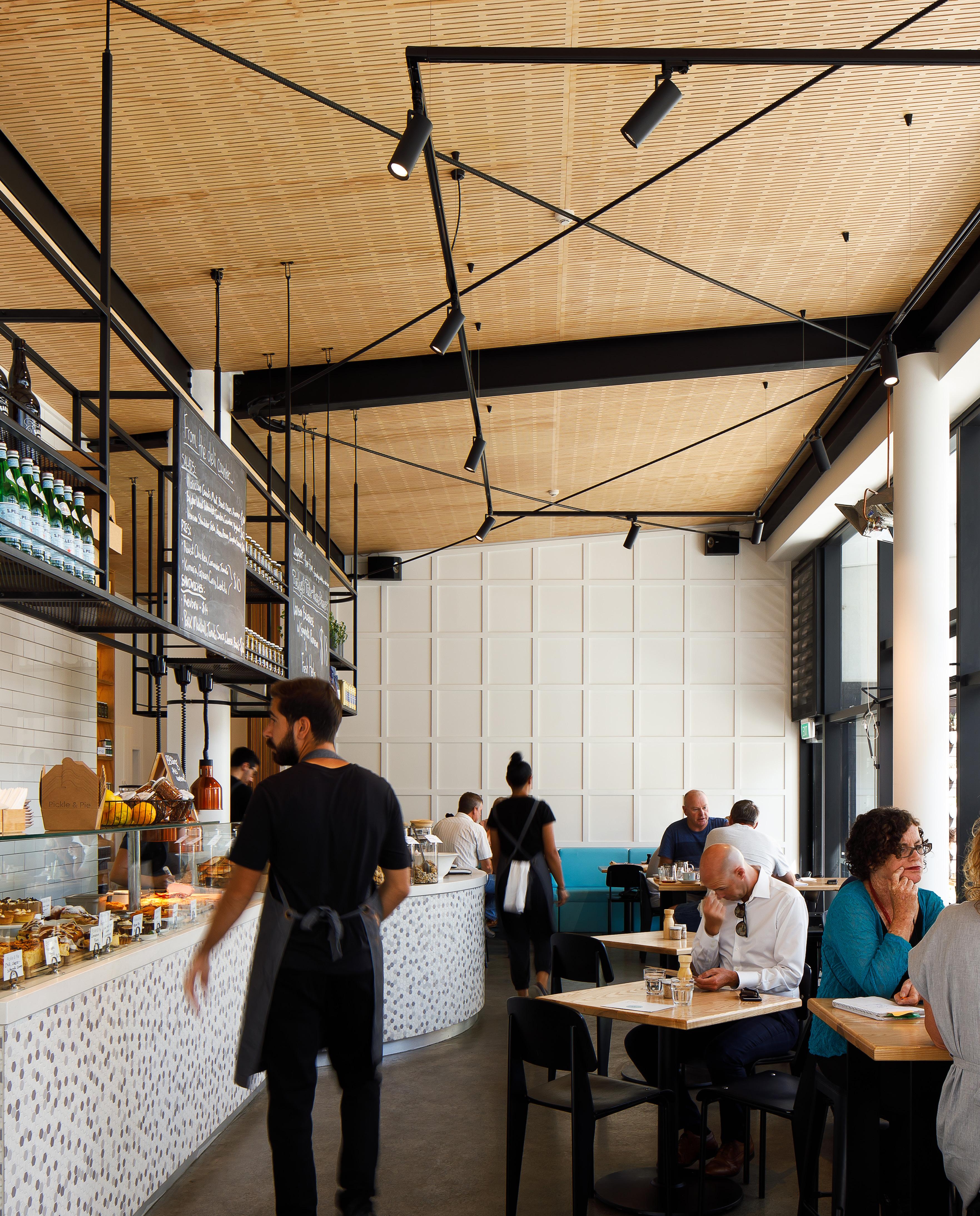 Finishes are functional and durable with tiled service area walls and counter fronts, polished concrete floors, natural timber acoustic ceilings and open black steel shelving responding to the exposed steel frame of the building.