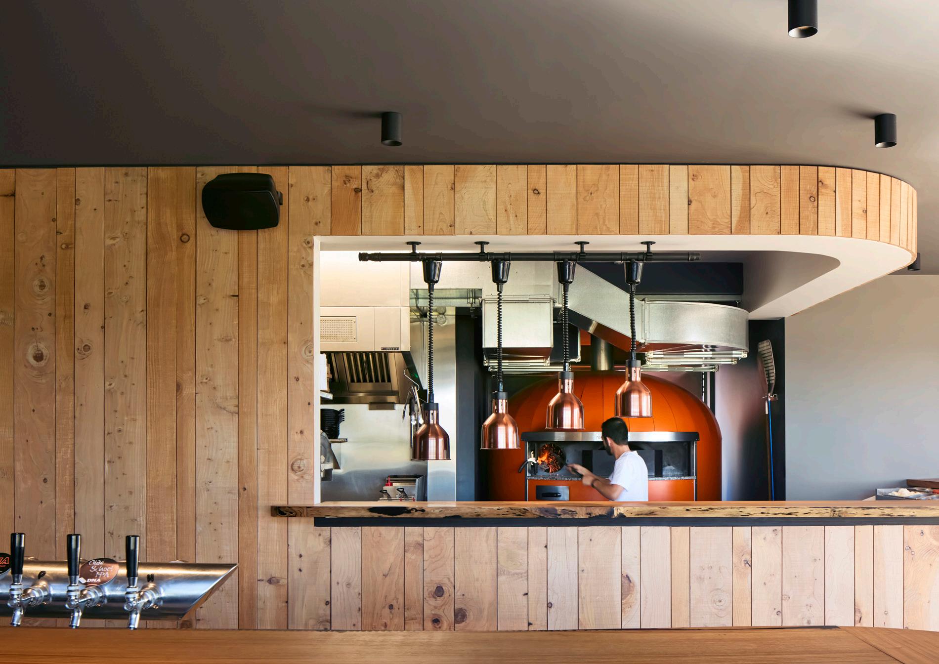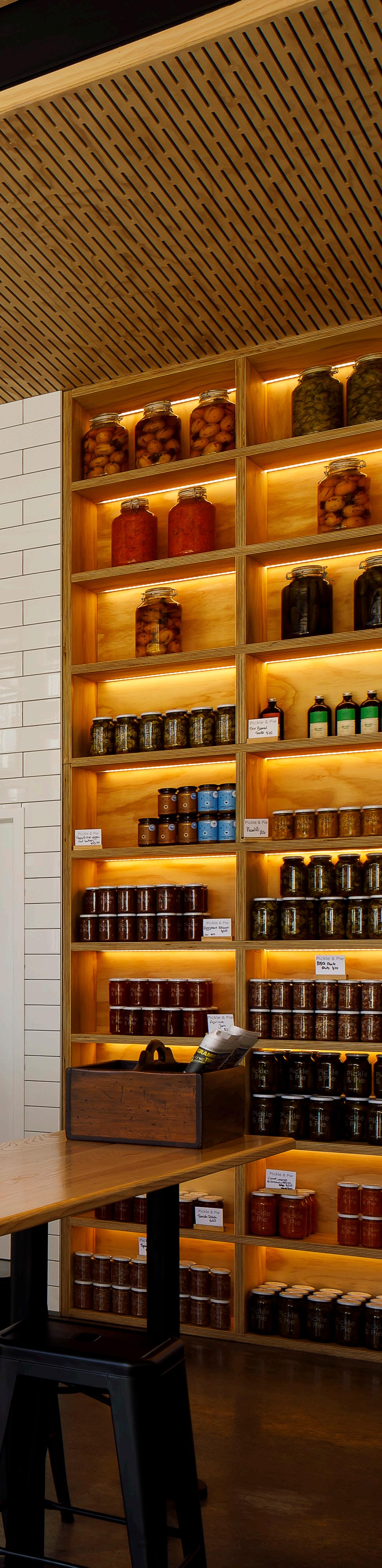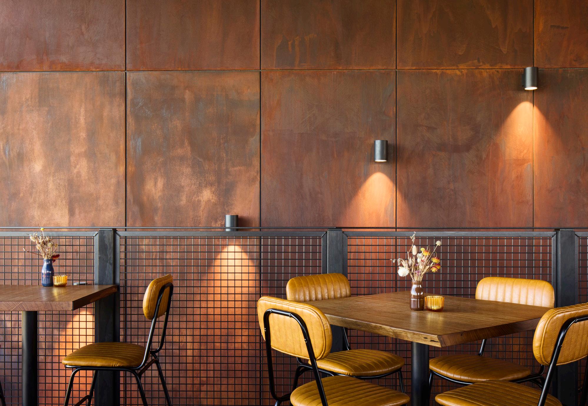 Inside, the brand identity becomes tactile. Himalayan cedar panelling milled from the owner’s property wraps the spaces with warmth and provenance, supported by live edge gum tables that introduce a natural, handcrafted presence. Sheet boarding finished with iron filings adds an earthy, rusted quality that