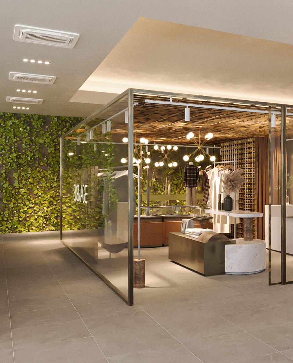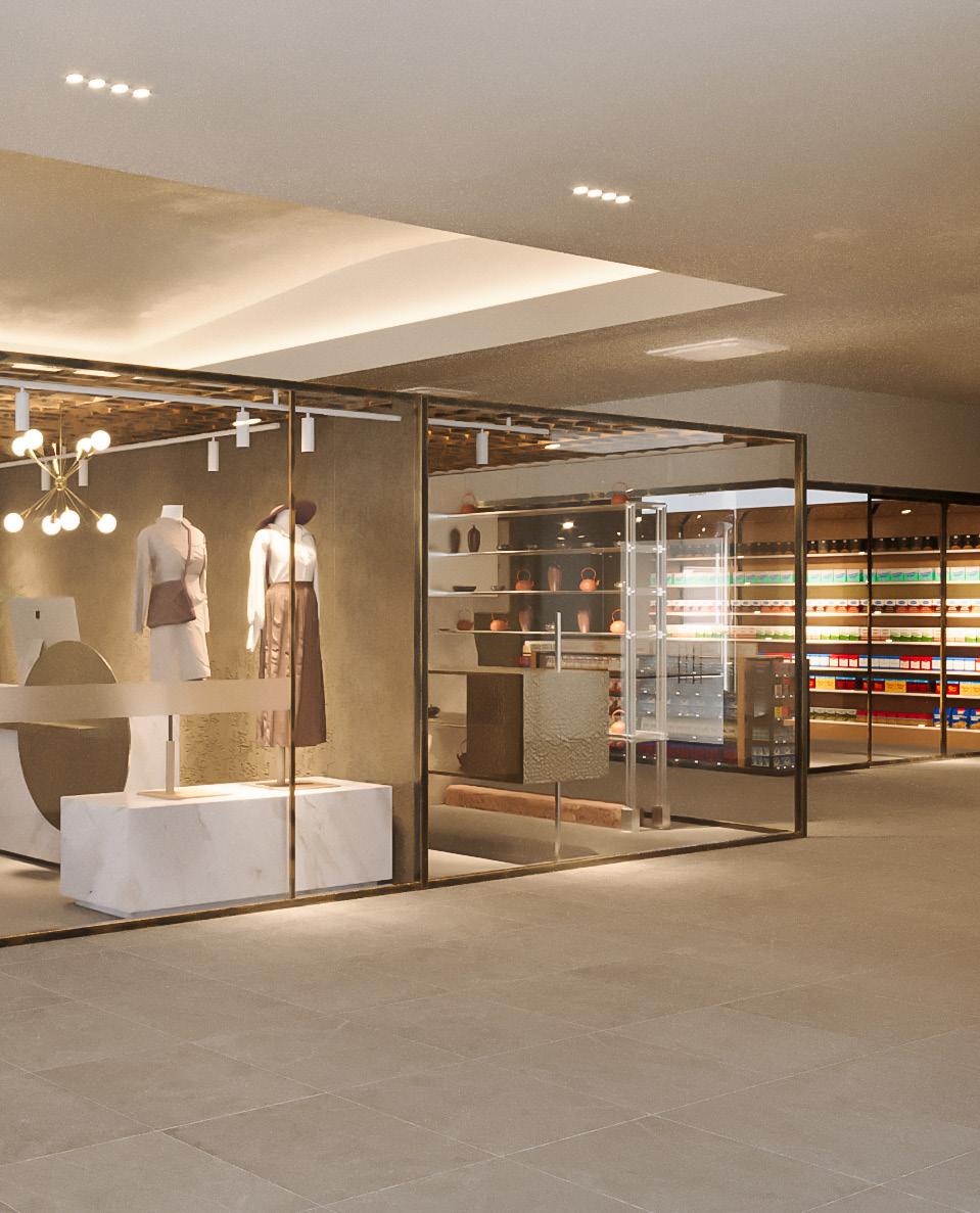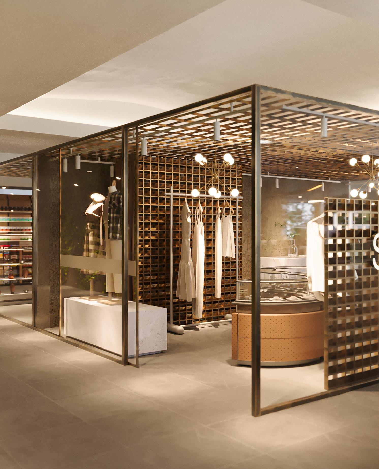 lighting installations elevate the retail experience, combining sculptural pendants, concealed linear lighting, and feature pieces designed to interact with the timber grids. The lighting concept celebrates shadow, detail, and craftsmanship, enhancing both day and night-time ambiance. Together, the interplay of glass, timber, and bespoke illumination creates a refined yet inviting atmosphere that balances modern retail design with local material expression.