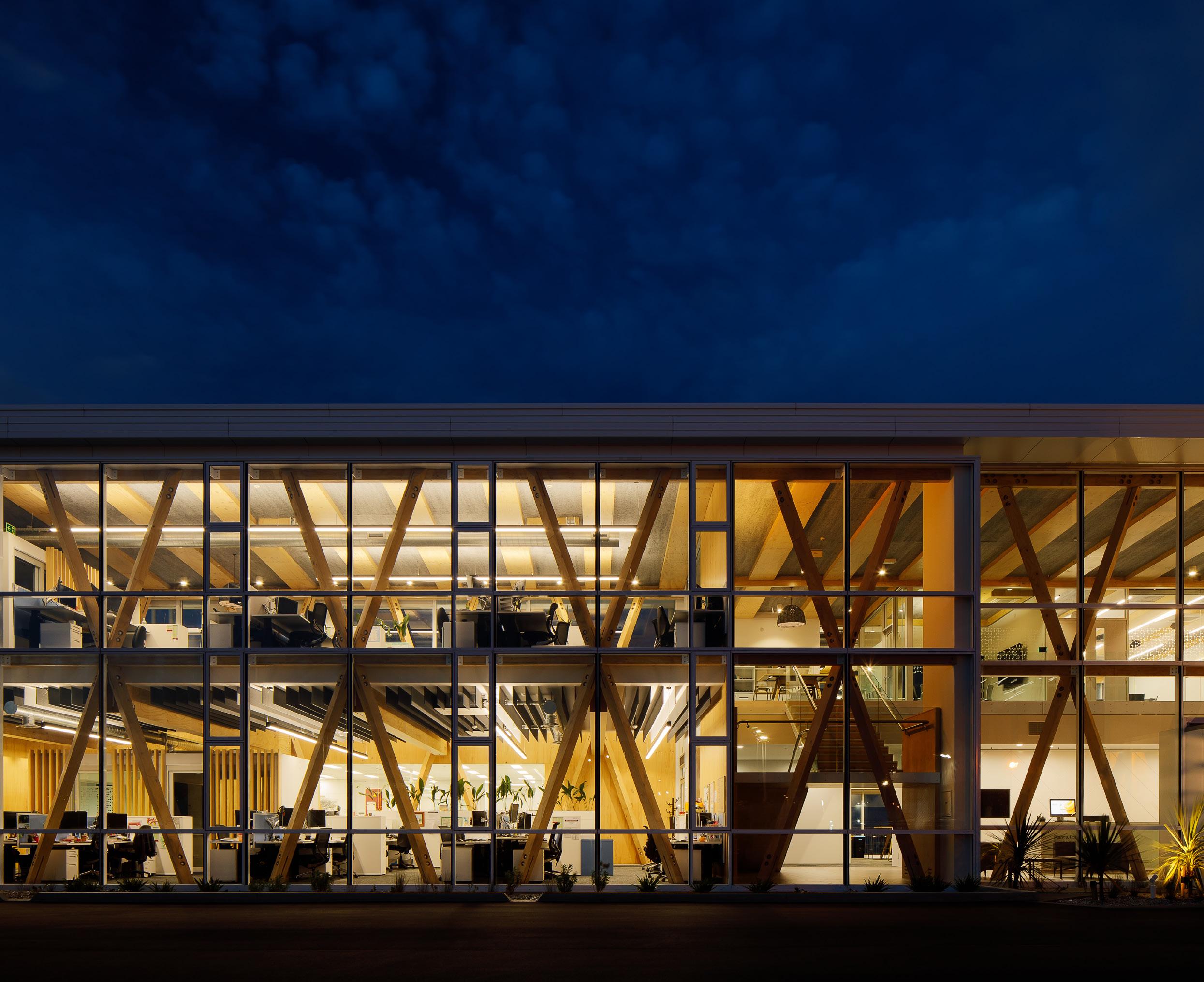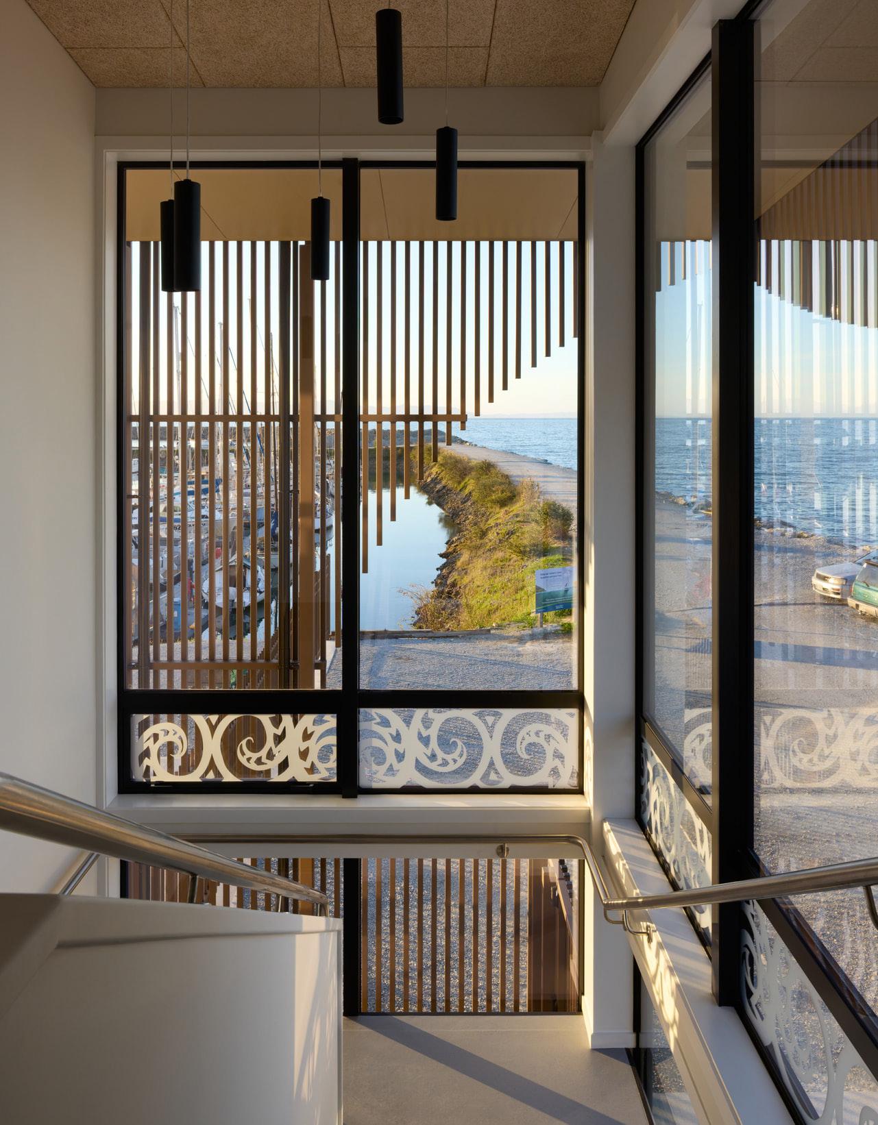 The main structure is expressed locally sourced (less than 100km) mass timber featuring a high level of prefabricated timber elements, including XLAM timber shear walls, LVL cross columns for lateral bracing, Poitus LVL flooring and roof components. Bound on water by three sides, the building is aluminium clad to provide a robust and durable exterior in this harsh marine environment.