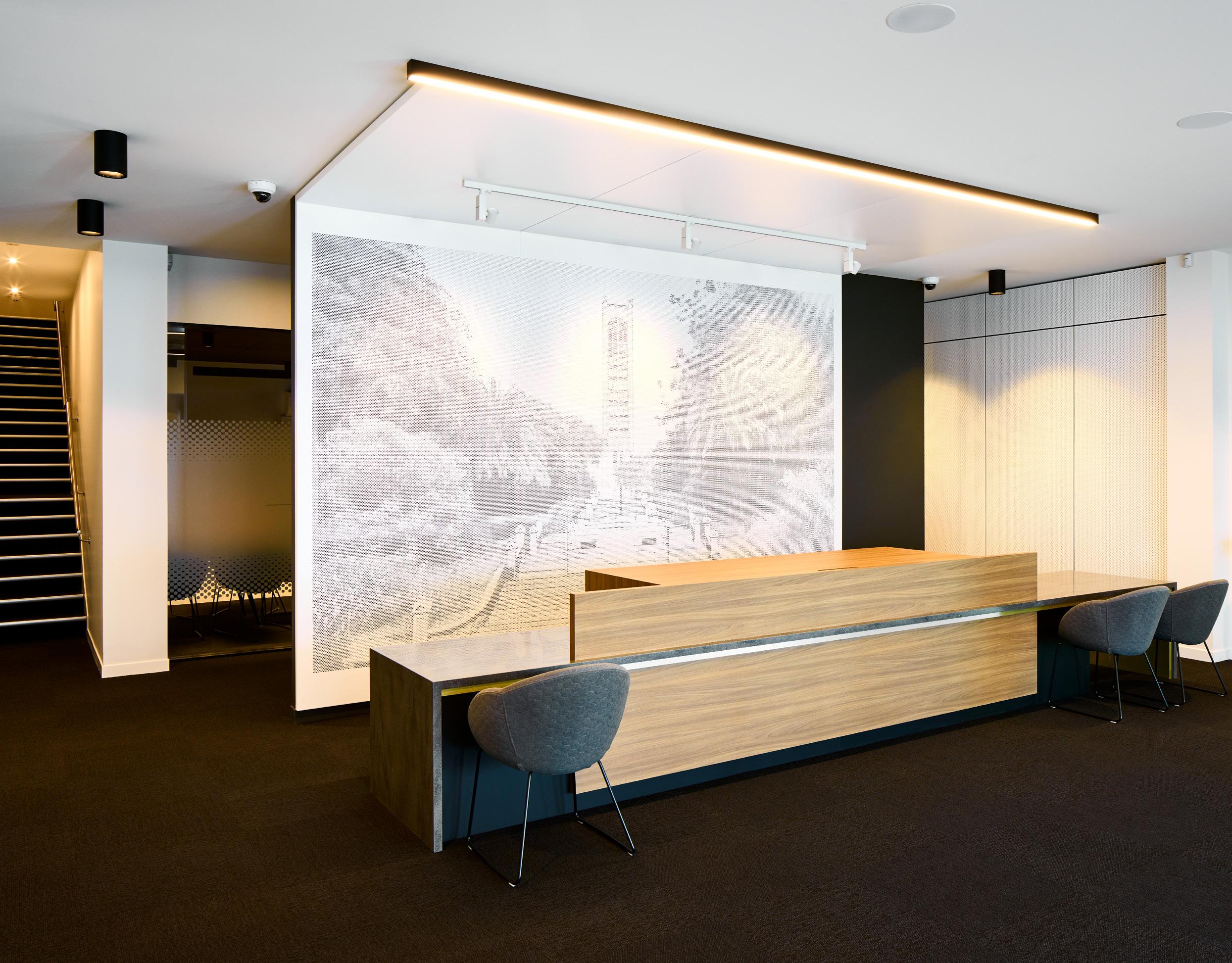 Acoustics were a major component of this project; noise levels in the busy reception space and open plan workspaces are managed through the use of materials that provided both texture and acoustic performance. Throughout the