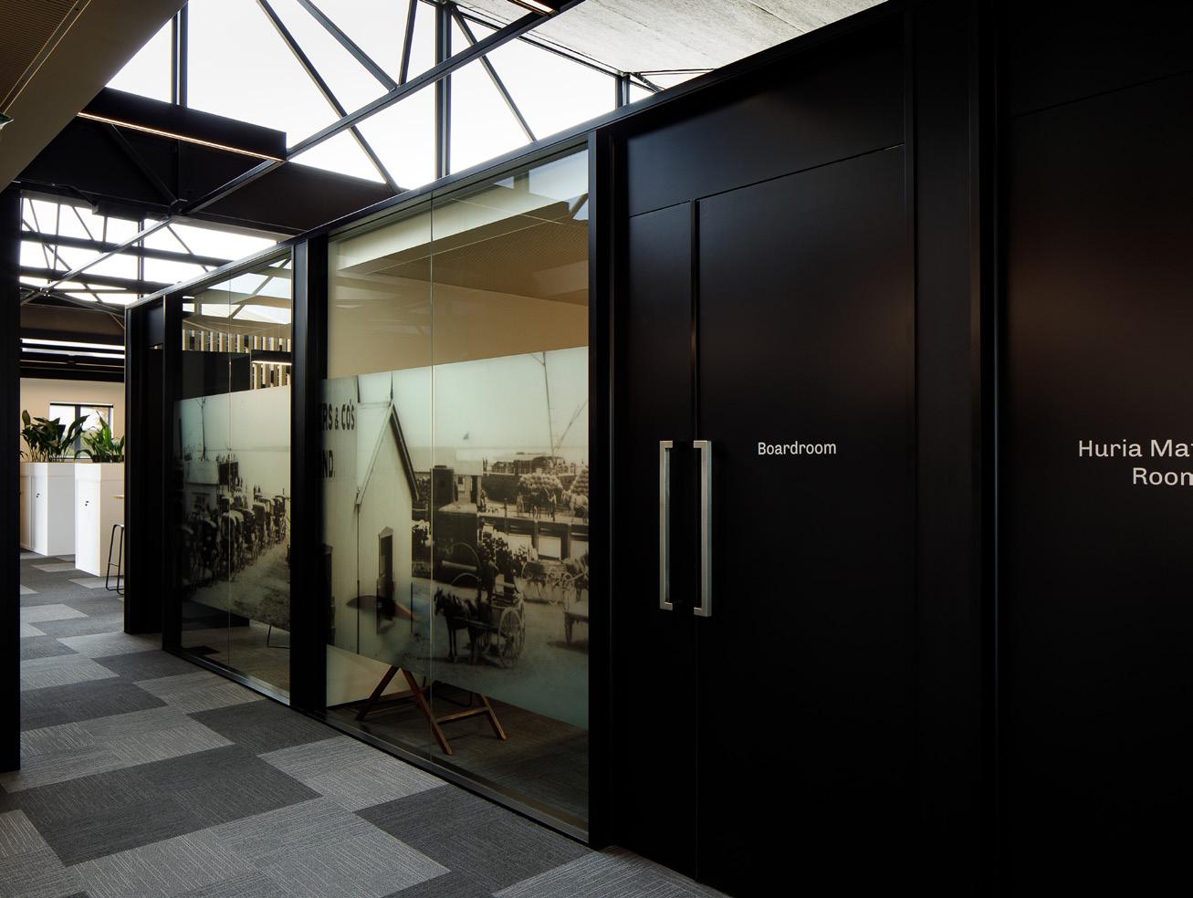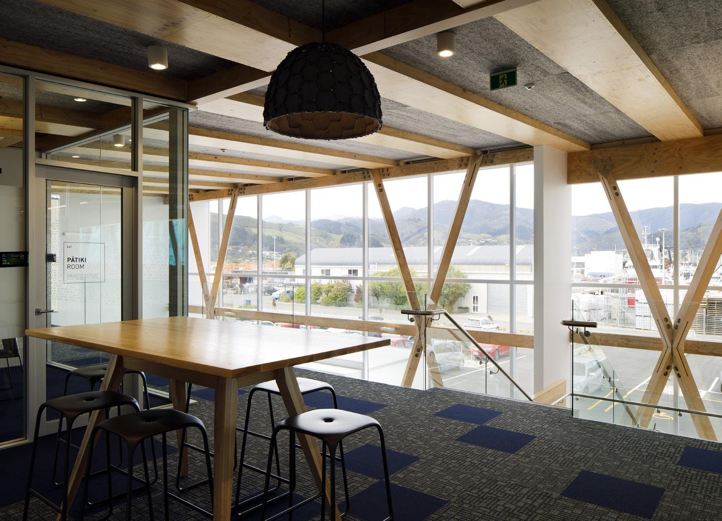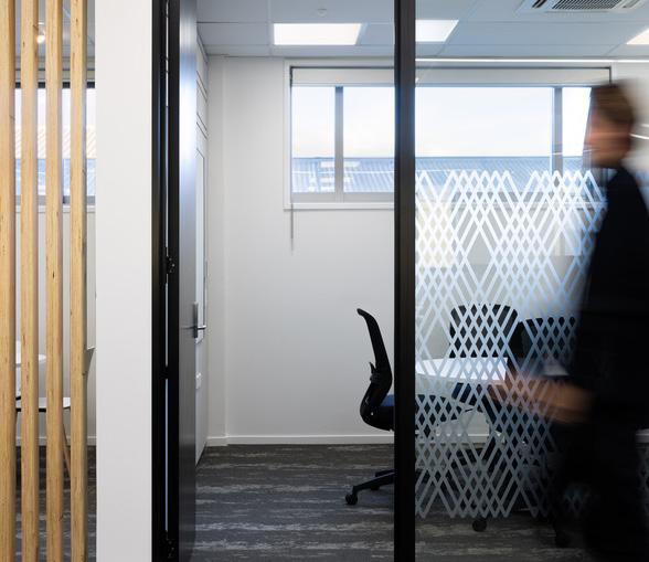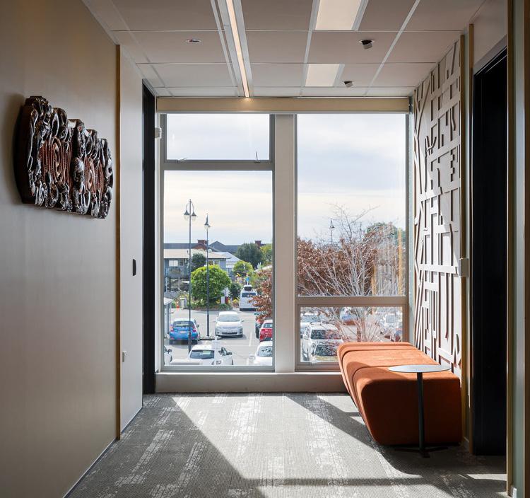 narrative of the pare through use of colour and pattern throughout the office acoustic panels and vinyl manifestations, with key design features of the pare being repeated throughout the space. The 375m² office space comprises mediation rooms, interview and breakout rooms for 22 employees, with a particular focus on security for guests and staff, in line with the governments workplace guidelines, security and IT requirements. The project was constructed by Gibbons Naylor, a branch of Naylor Love in the Nelson Tasman region.