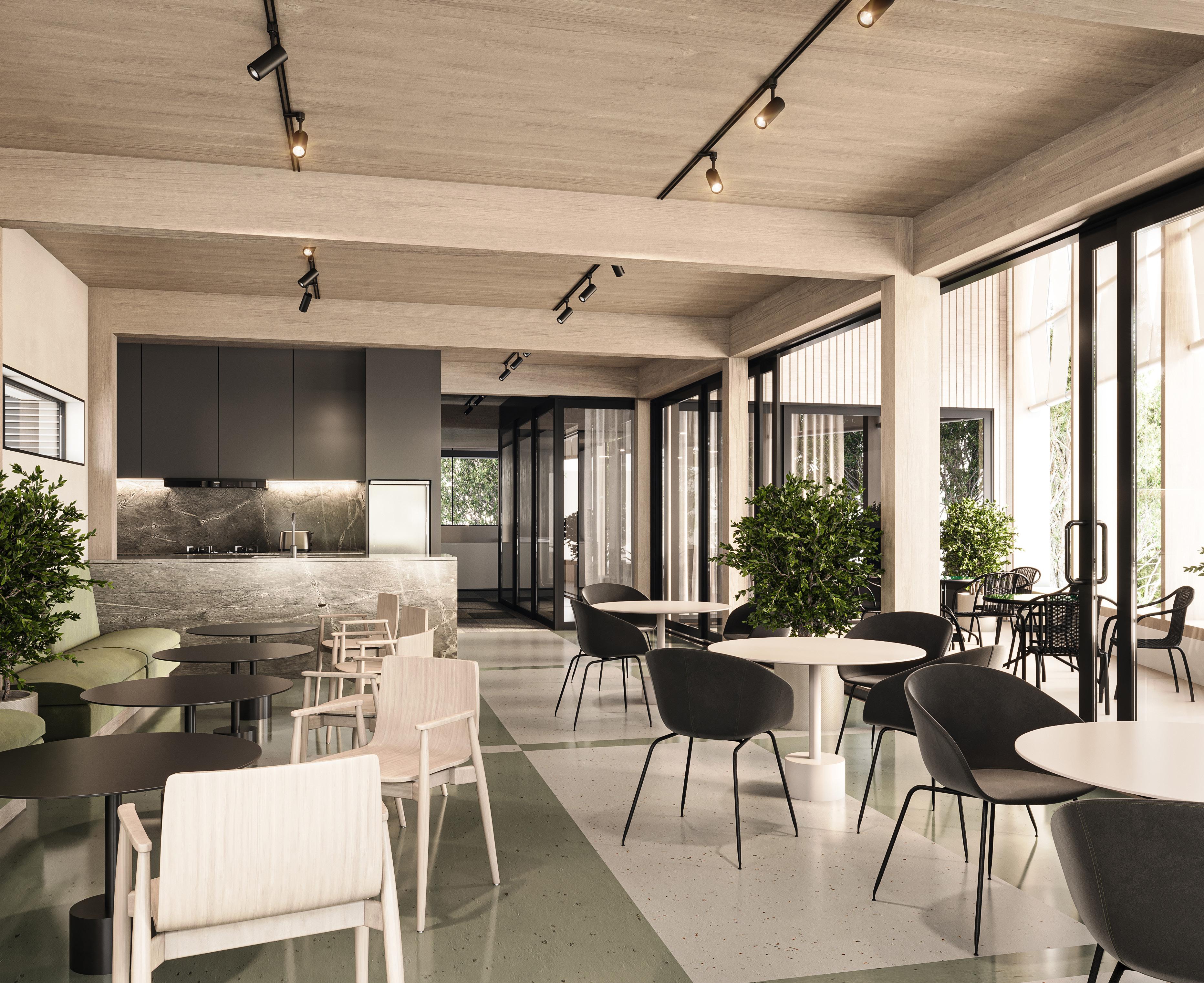 On the new first floor, full height operable partitions provide flexibility through allowing for the boardroom and cafe to be open to one another for large meetings, or create two separate rooms.