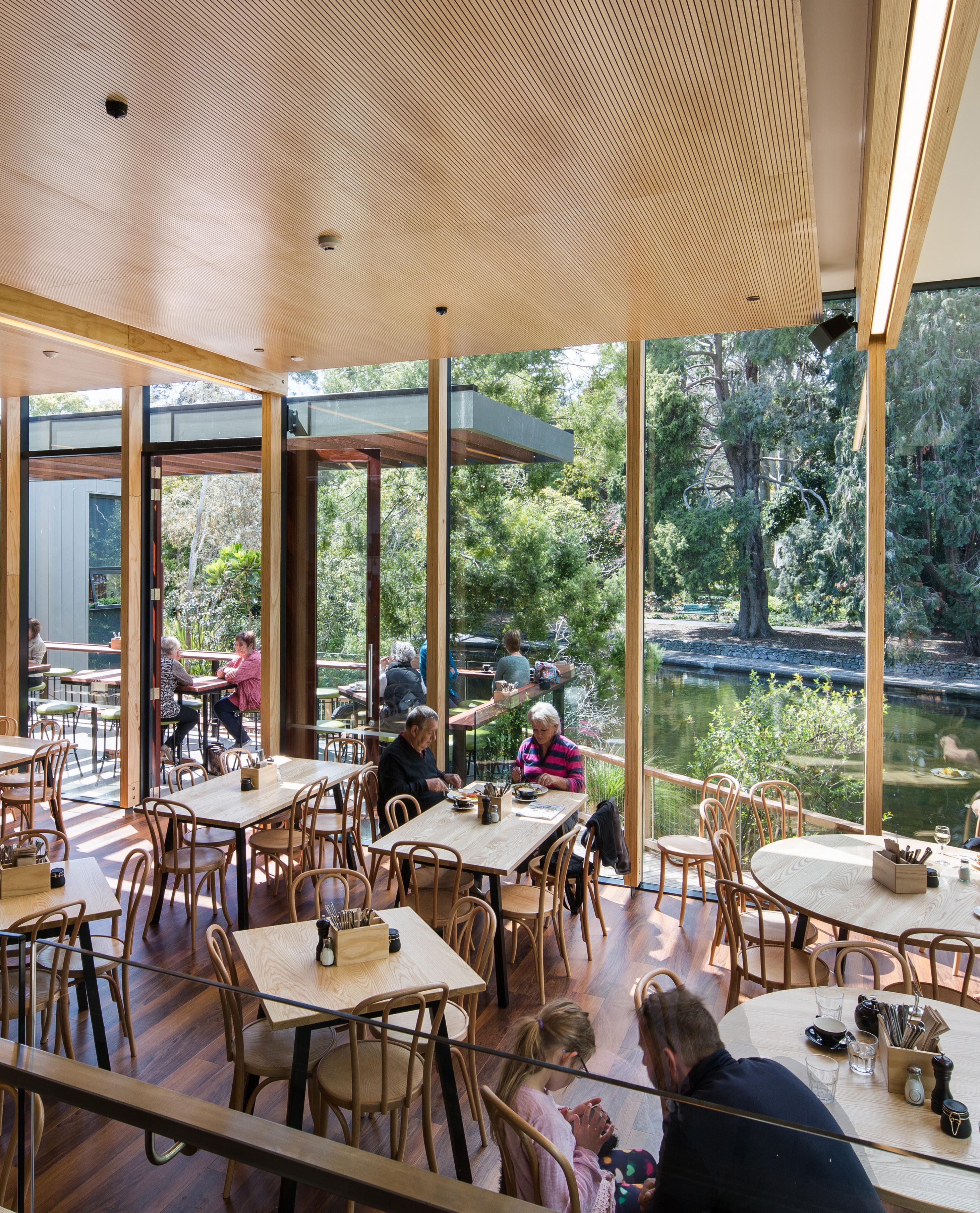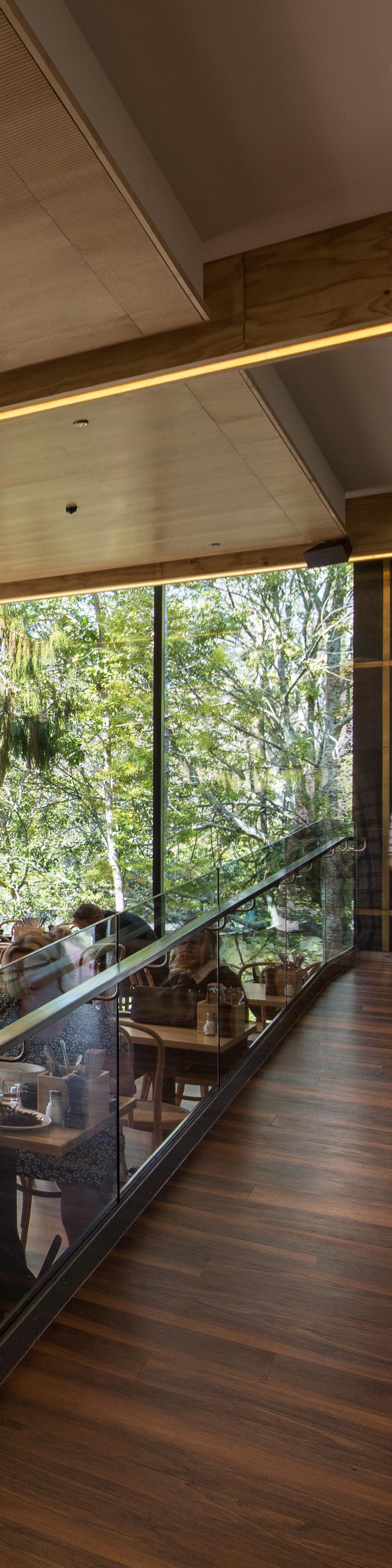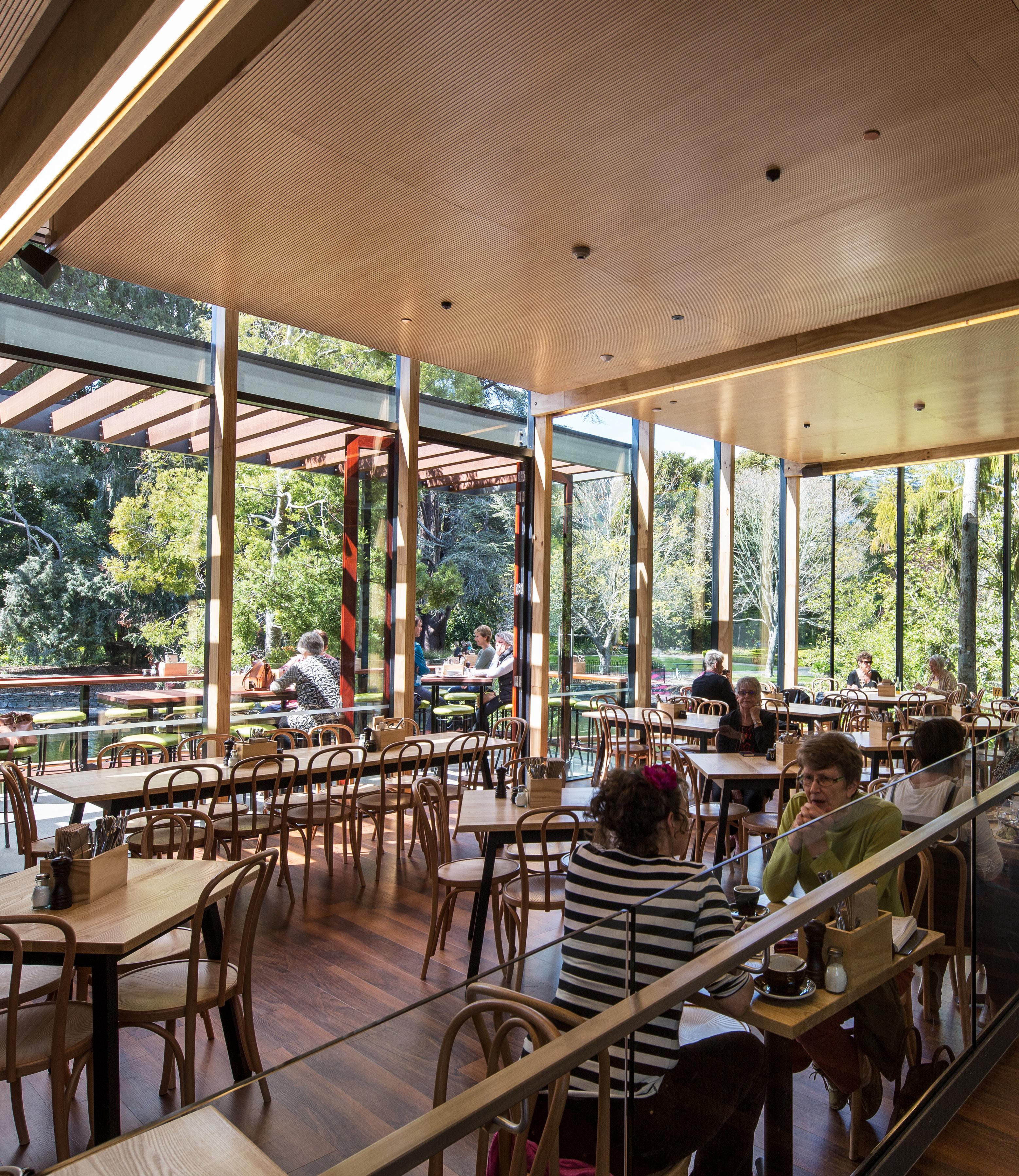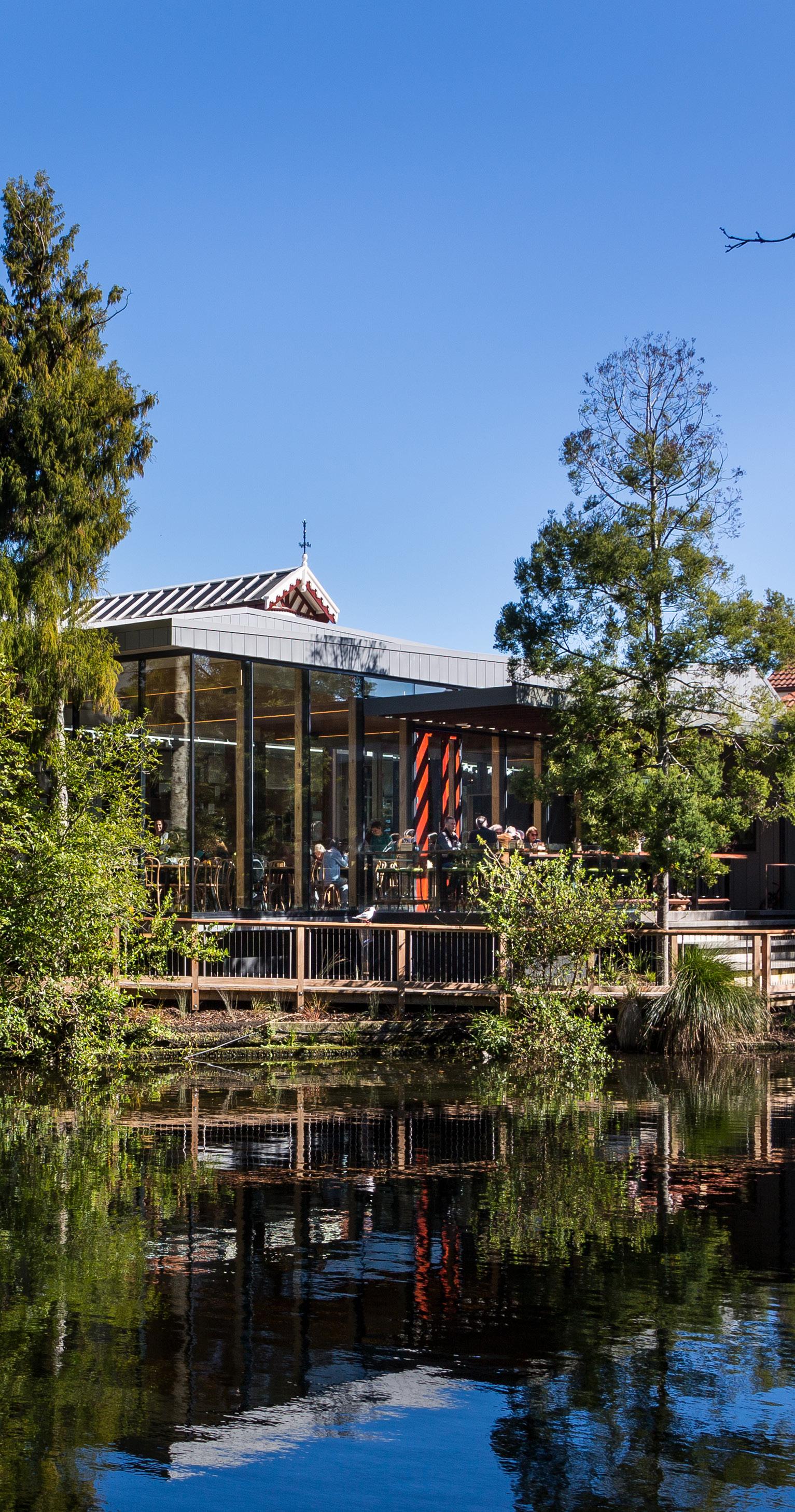The café interior acts as a bright, welcoming hub, with expansive glazing framing views of Queens Gardens and its water feature. Natural light, warm materials, and flexible indoor–outdoor seating respond to Nelson’s climate, offering a contemporary environment that complements the restored heritage architecture.