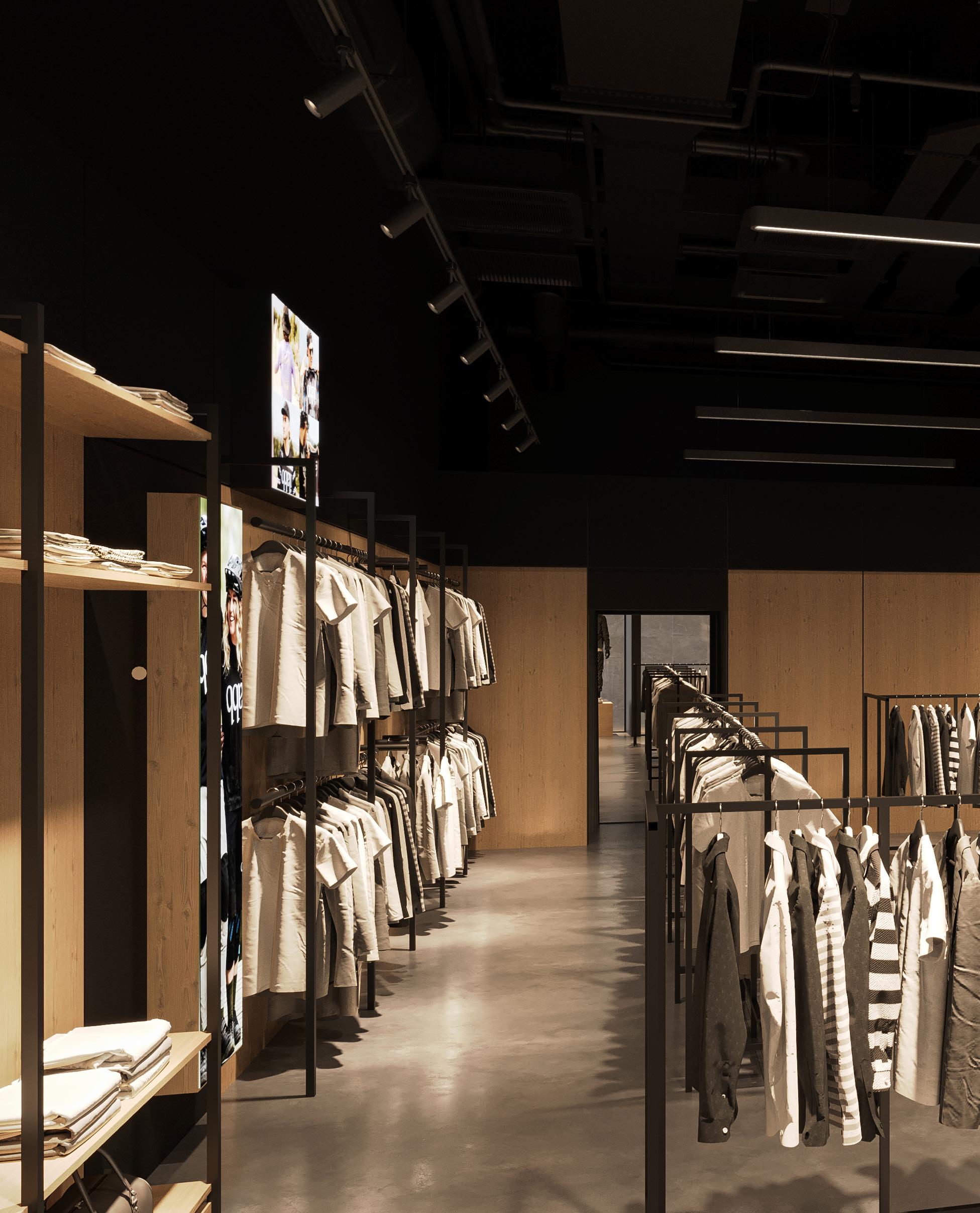 Concrete floors and an exposed ceiling create an industrial base that lets the brand’s visual language