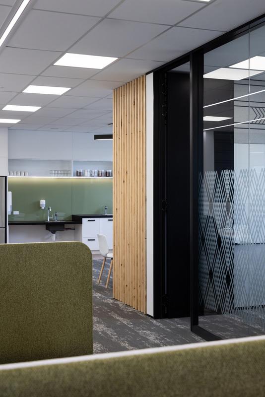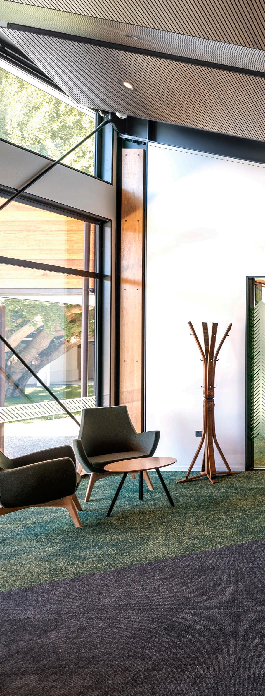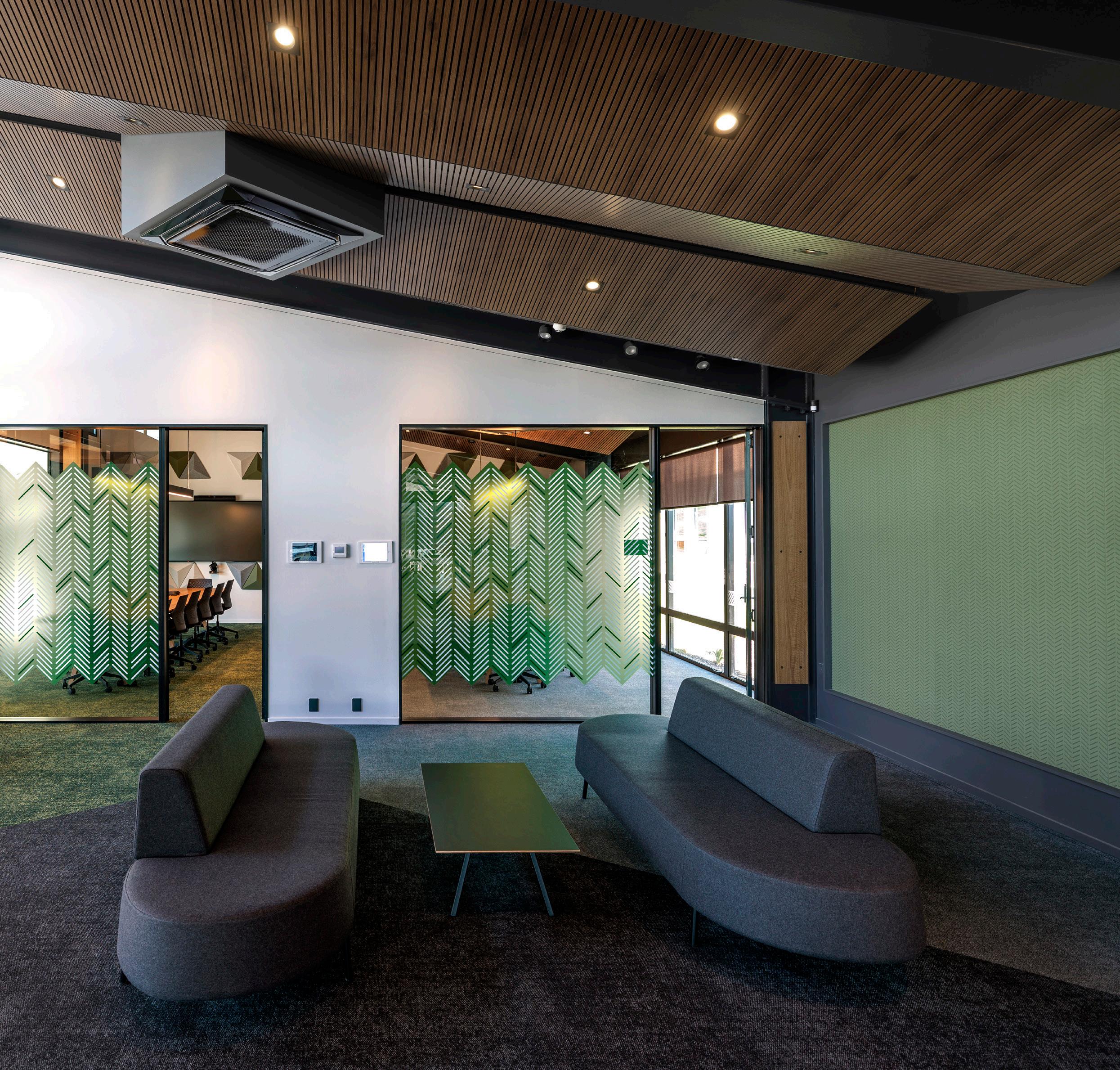 Internally, a simple but sophisticated scheme has been used throughout the internal finishes. Lush green carpet and folded plate ceilings lined with locally grown hardwood link all the spaces, while the superstructure, picked out in black, recedes. All spaces have a strong focus on acoustic performance, with grey and white triangulated acoustic panels covering meeting room walls.