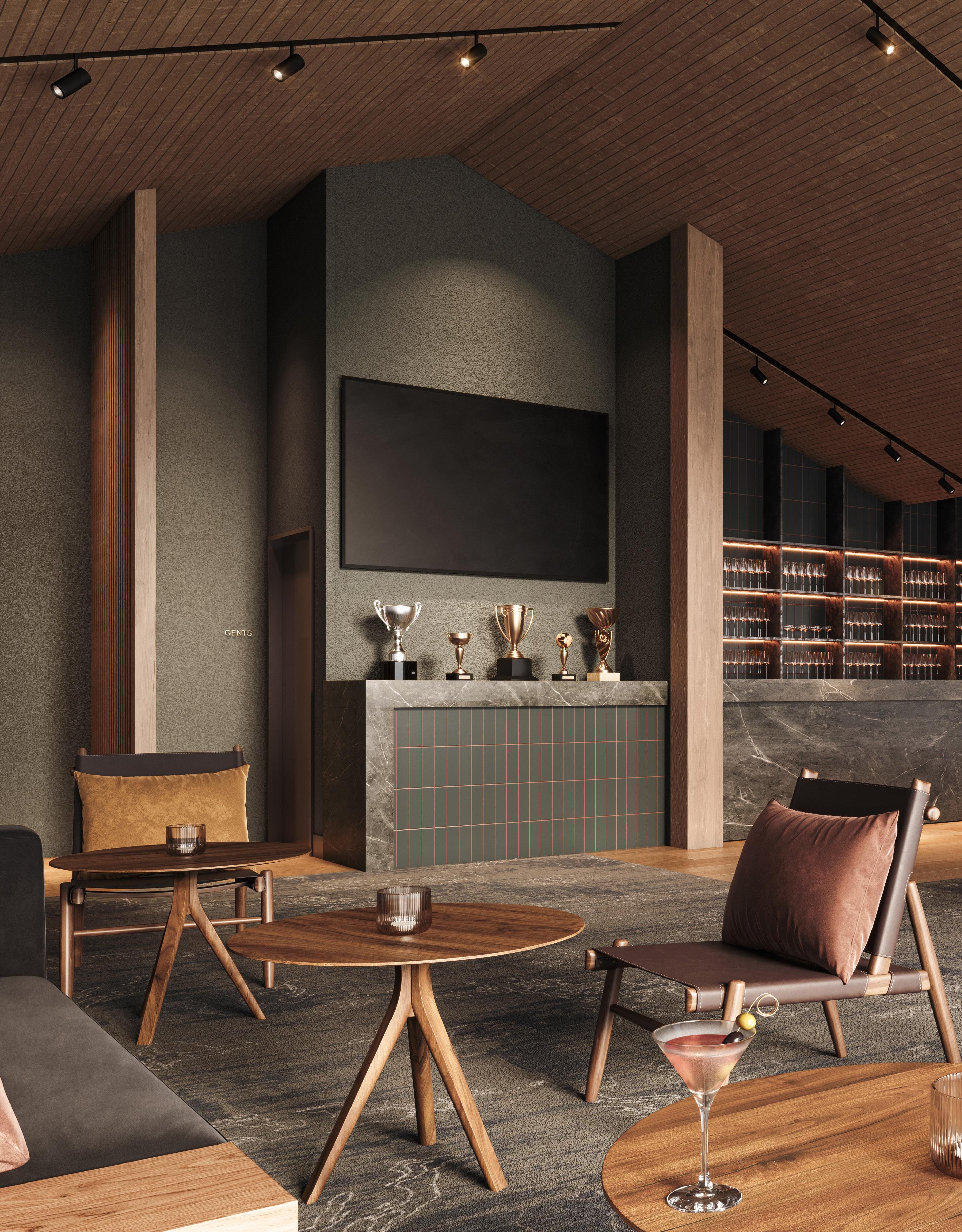 The design uses a dark and refined palette that reflects the dramatic landscape surrounding the club. Deep timber finishes, rich textures, and controlled lighting establish a sense of comfort and sophistication.