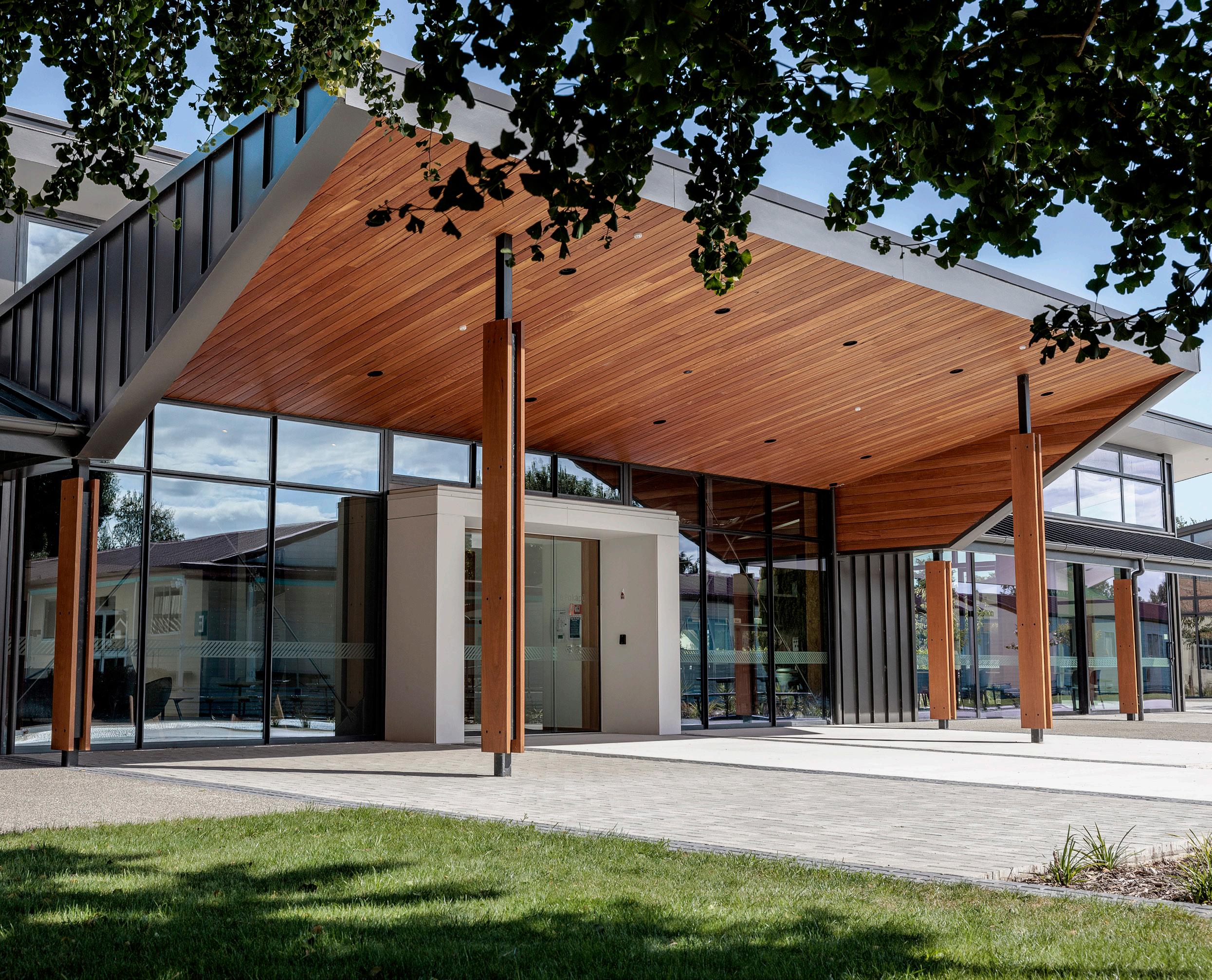 Placed in what was previously an area occupied by prefab buildings, the NZWC building provides formal and informal spaces over 392m2; including conference area, meeting rooms and a cafeteria to accomodate 80+ people. Expansive glazing along the eastern side creates a sense of openness and connection to the redeveloped courtyard space and surrounding campus.