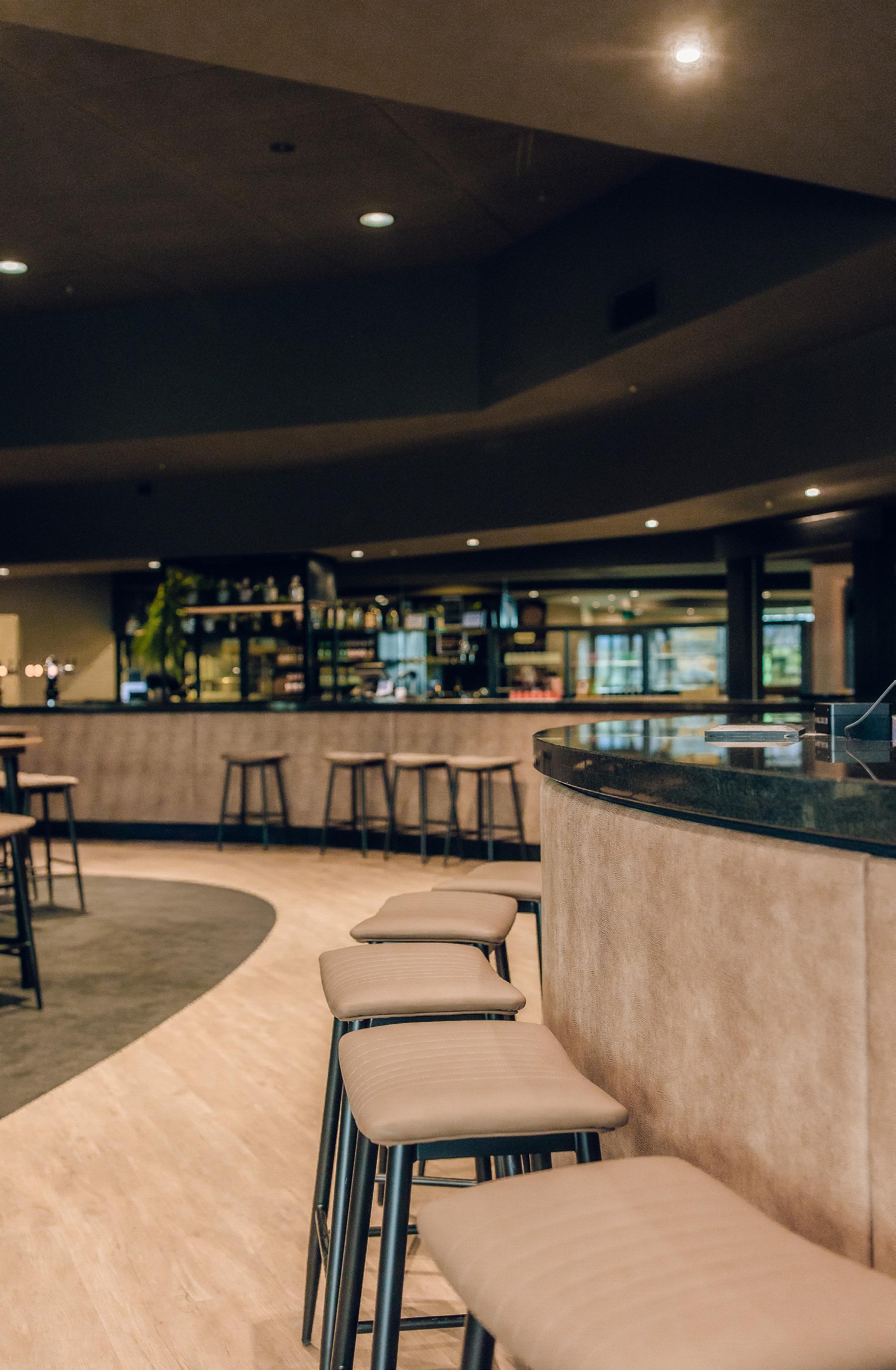 A deep forest green accent colour is used with precision to reinforce the club’s identity and its relationship to the landscape. This single green tone recalls the fairways and native vegetation surrounding the site. Upholstery, feature walls, and selected furniture pieces incorporate this colour to bring depth and balance to the darker foundational palette. The combination of dark finishes, warm timber, and the deep forest green creates an interior that feels grounded, comfortable, and contemporary. The atmosphere supports social gathering and relaxation while expressing a clear connection to the natural beauty and character of the Queenstown Golf Club.