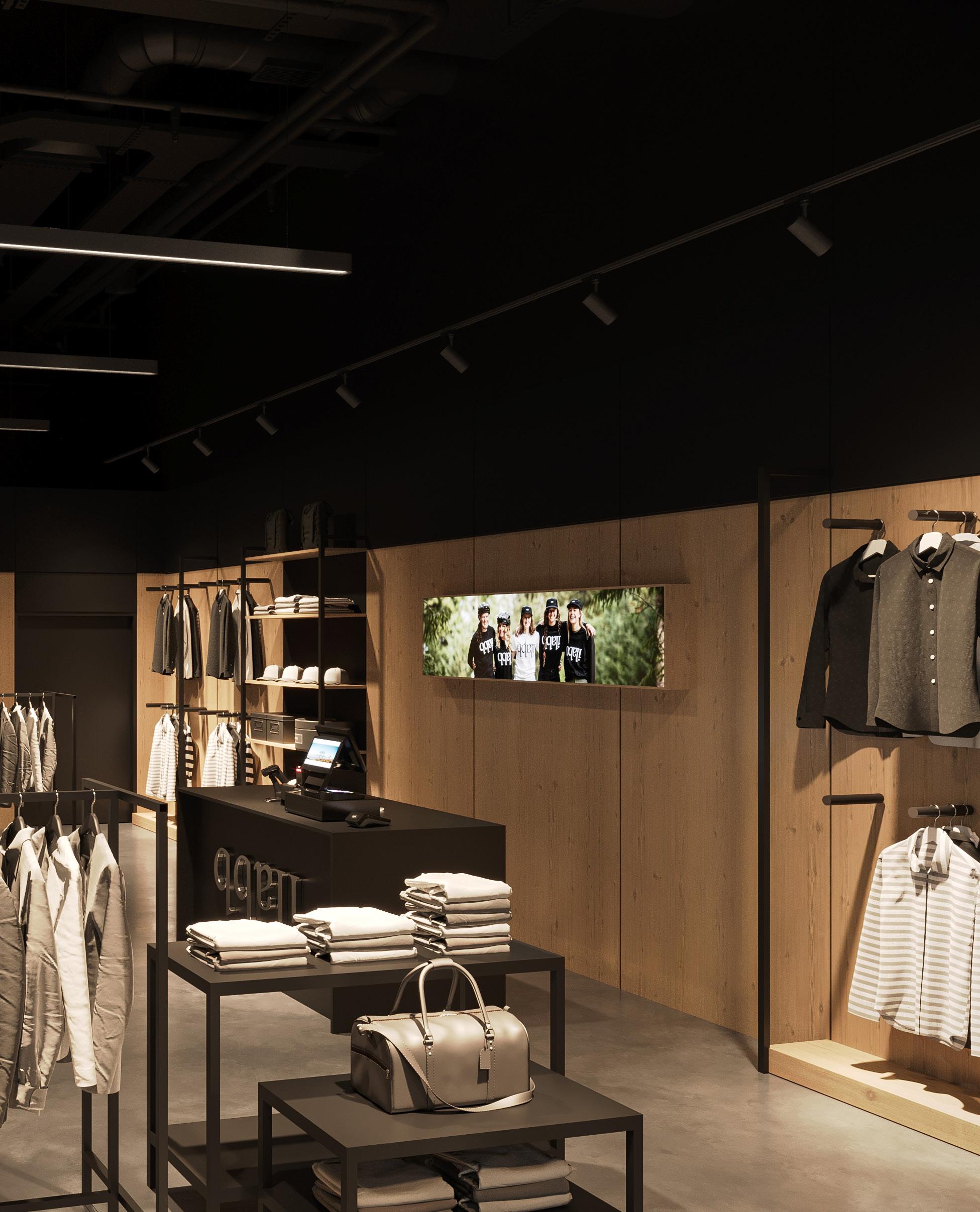 stand out. Custom lightboxes shape the lighting strategy, highlighting product zones and reinforcing ilabb’s graphic edge. Large-scale imagery delivers immediate impact, and a bespoke plywood service desk anchors the entry with durability and craft.