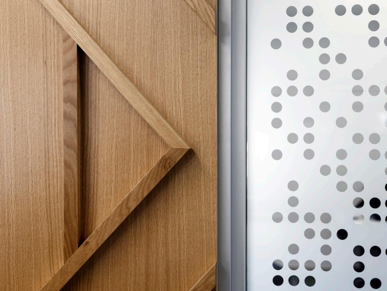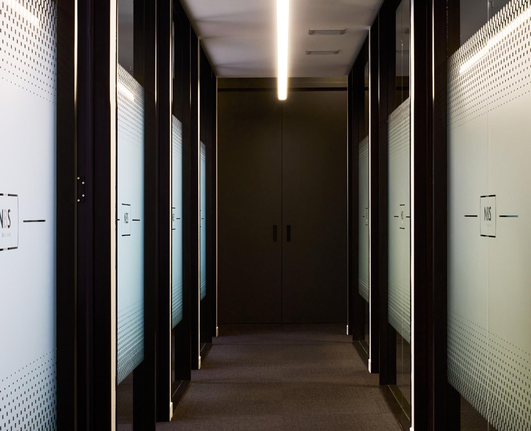 The interior palette references NBS’s historic palette through use of brass and warm timber, and the black and white of archive imagery; the detailing brings together the historic elements