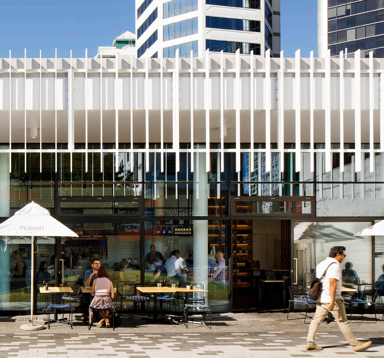 Located in a sunny sheltered area of Wellington’s CBD, the interiors open to outside dining space adjacent to a public pocket park, providing an active edge that draws customers in.
