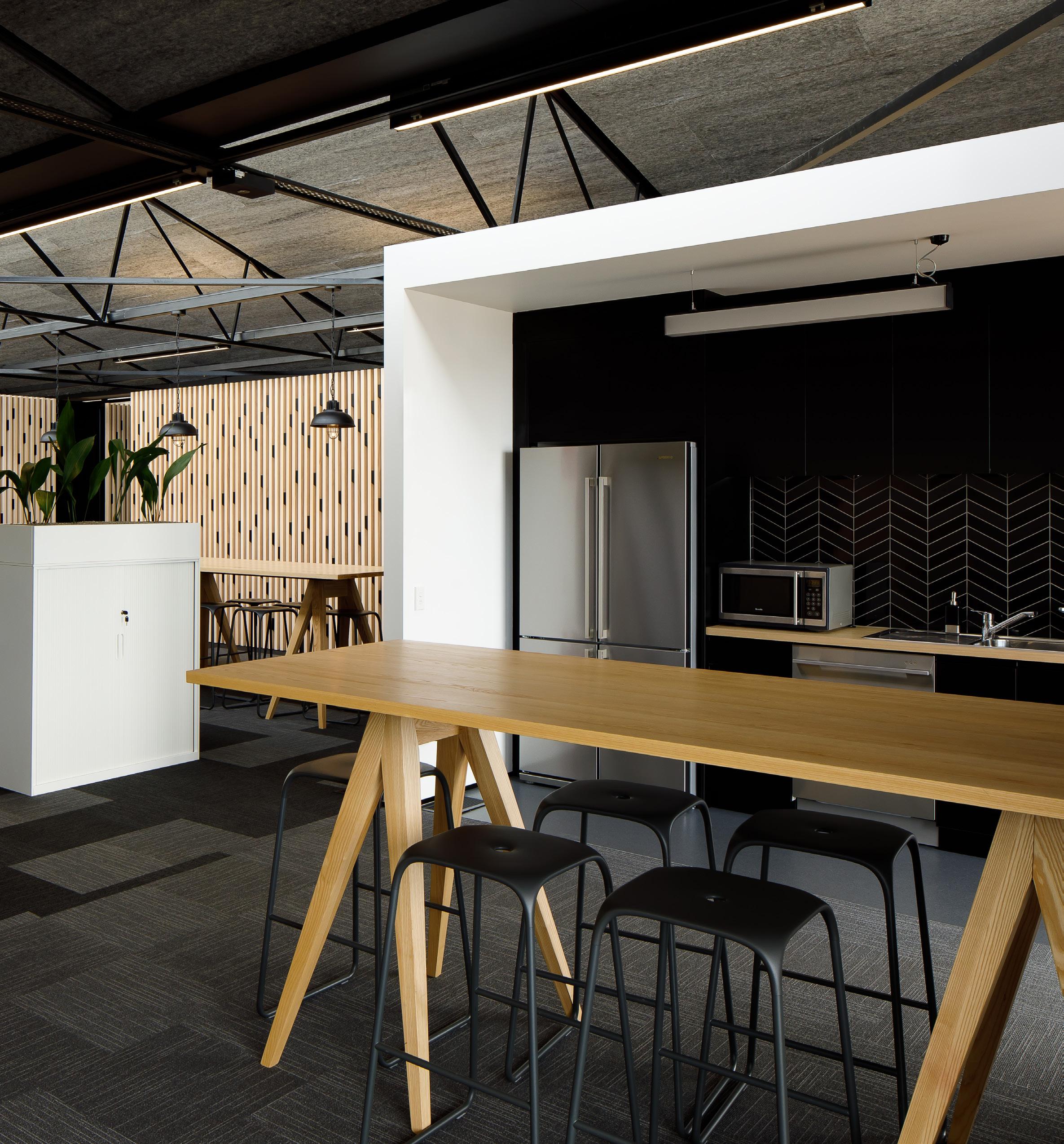 The building's structure is left exposed to illustrate Scott Construction's building materials and techniques, Adjacent to the office, the 1,043-square-metre workshop maintains a similar aesthetic, with five-ribbed metal cladding, clear roof panels for natural lighting, and solar panels to support energy efficiency. Staff facilities include a break room and a deck area, creating a practical and cohesive workspace alongside the main office.
