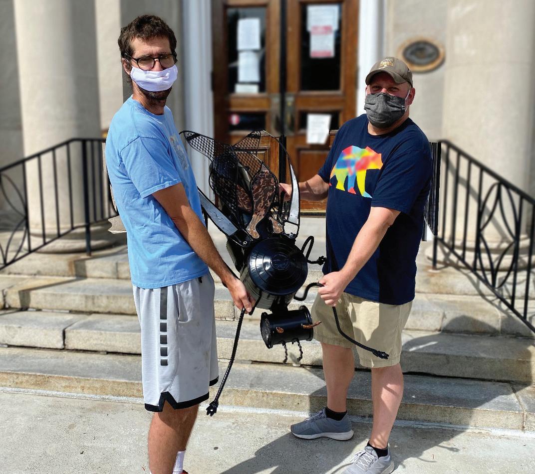 Larry Robjent, left, gives the black fly sculpture he created to Saranac Lake business owner Adam Harris.