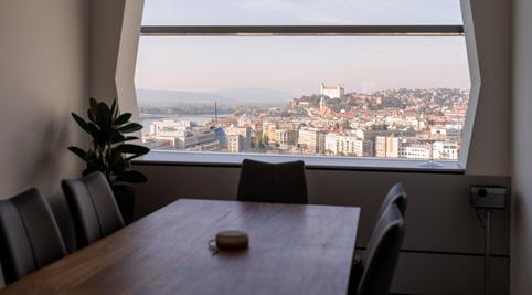 Priateľskú atmosféru priestorov kancelárií dotvára dizajnérsky navrhnutá chillout zóna a plne vybavená kuchynka ako stvorená na ranné kávičkovanie v office. A to vždy chutí lepšie s krásnym panoramatickým výhľadom na Bratislavu, ktorý ponúkajú dve zasadacie miestnosti.